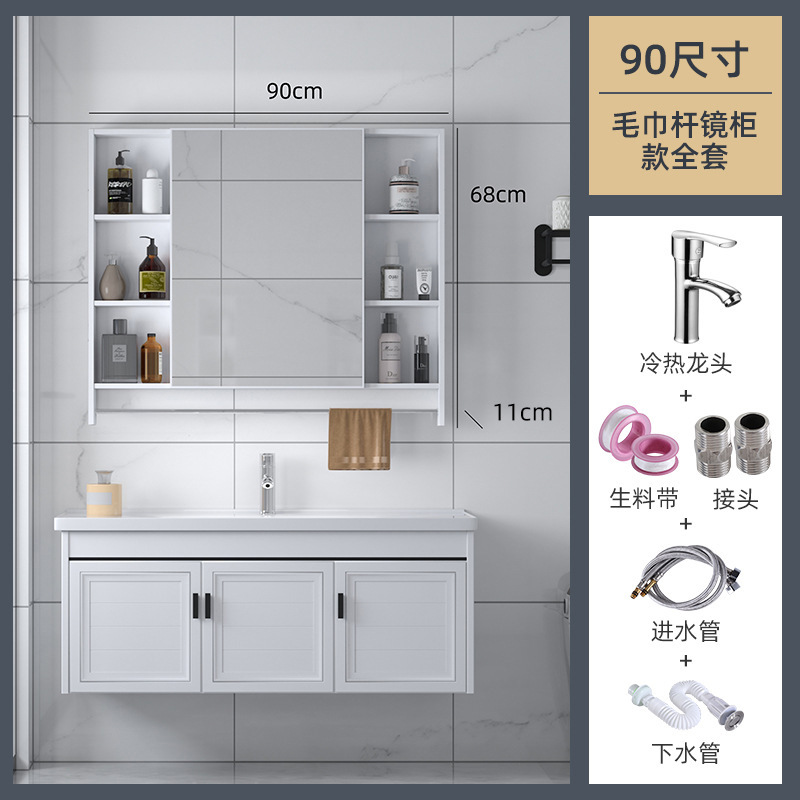 【白吊柜】90CM新款盆+龙头+毛巾杆镜柜