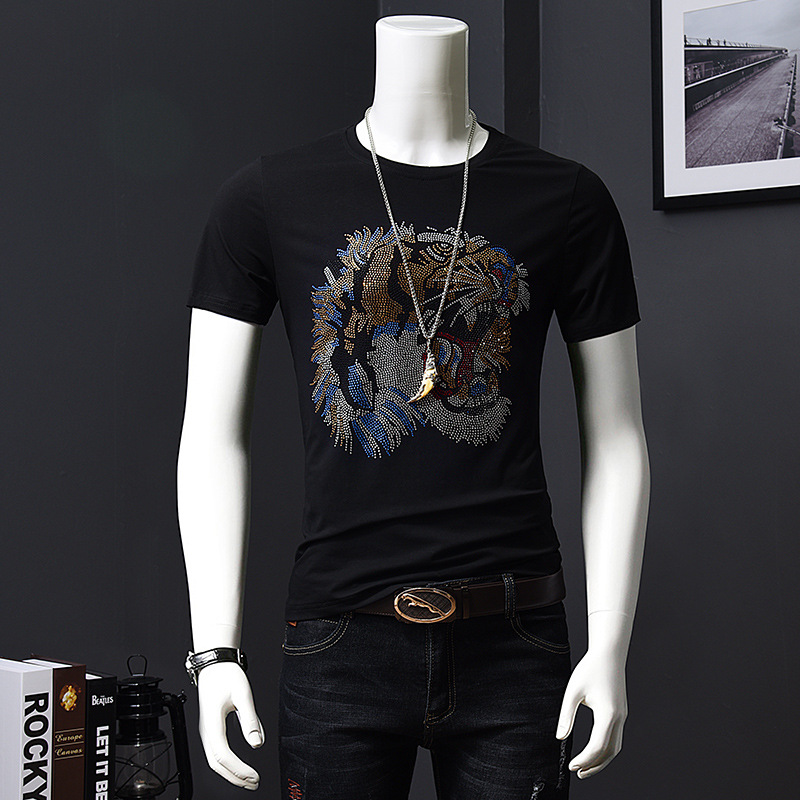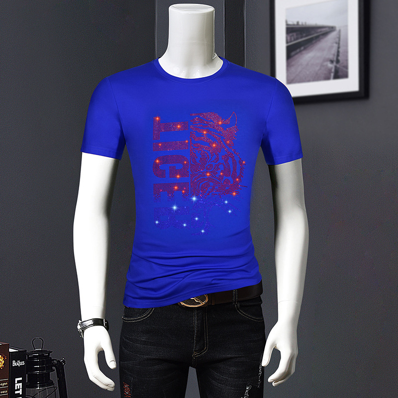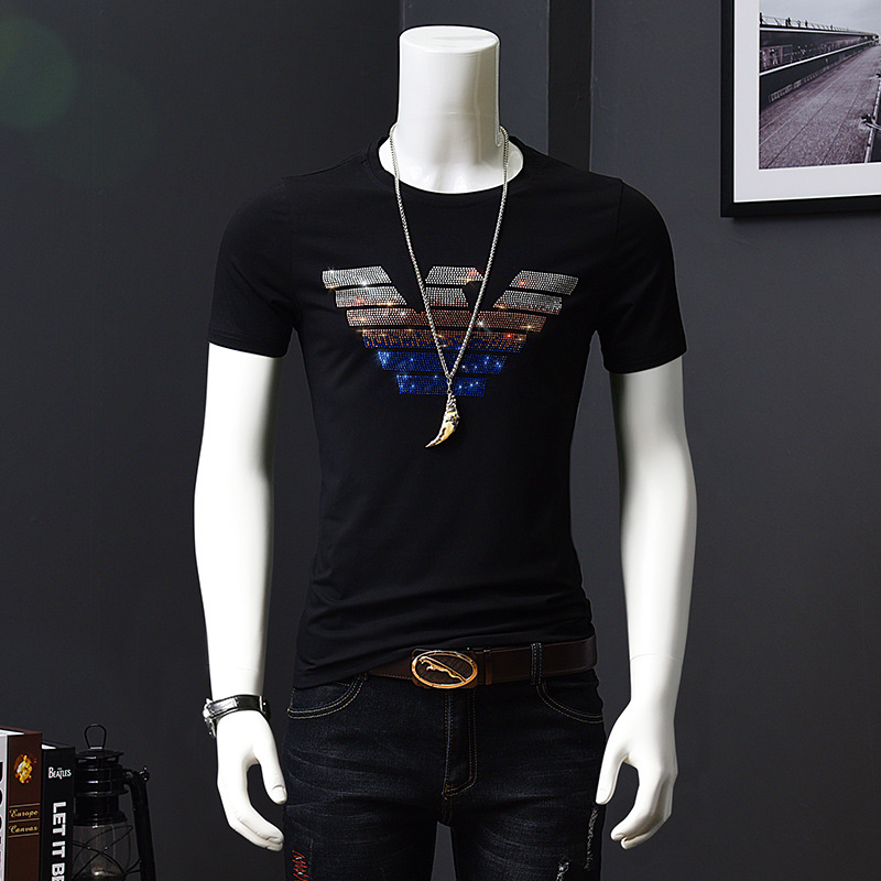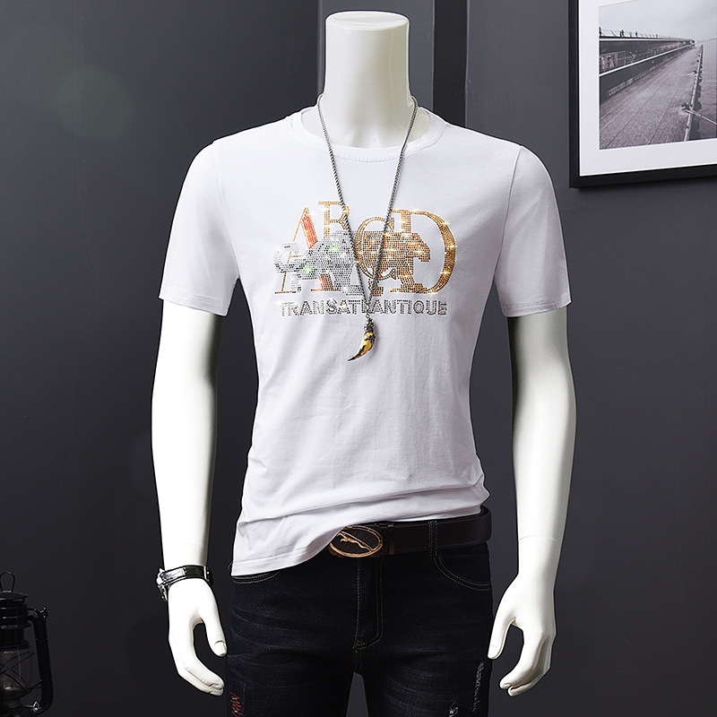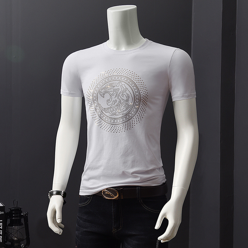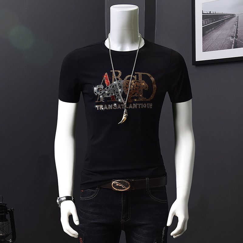 欧洲站夏季短袖t恤男潮流烫钻丝光棉冰丝时尚修身青年半袖打底衫
