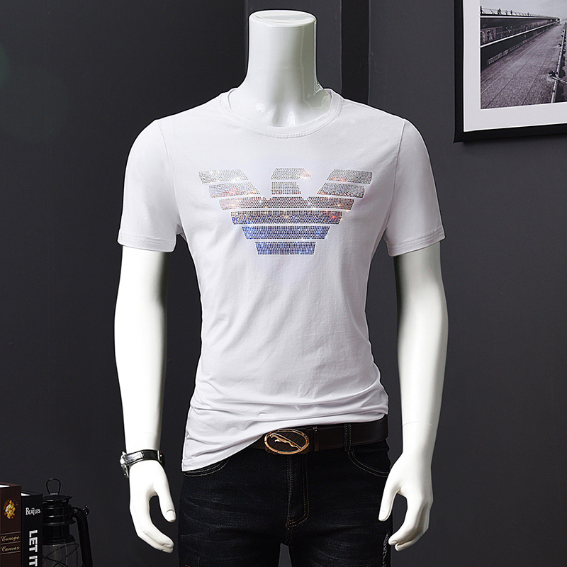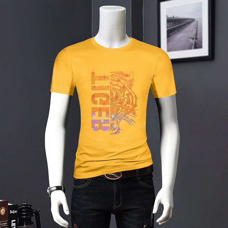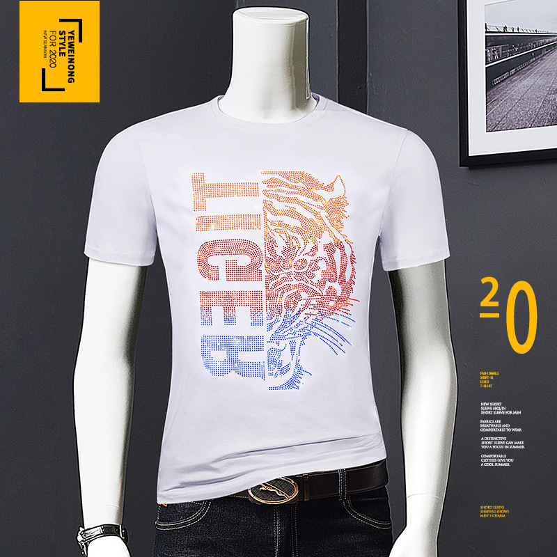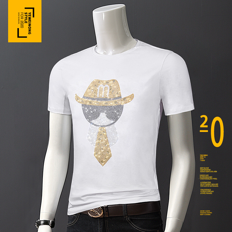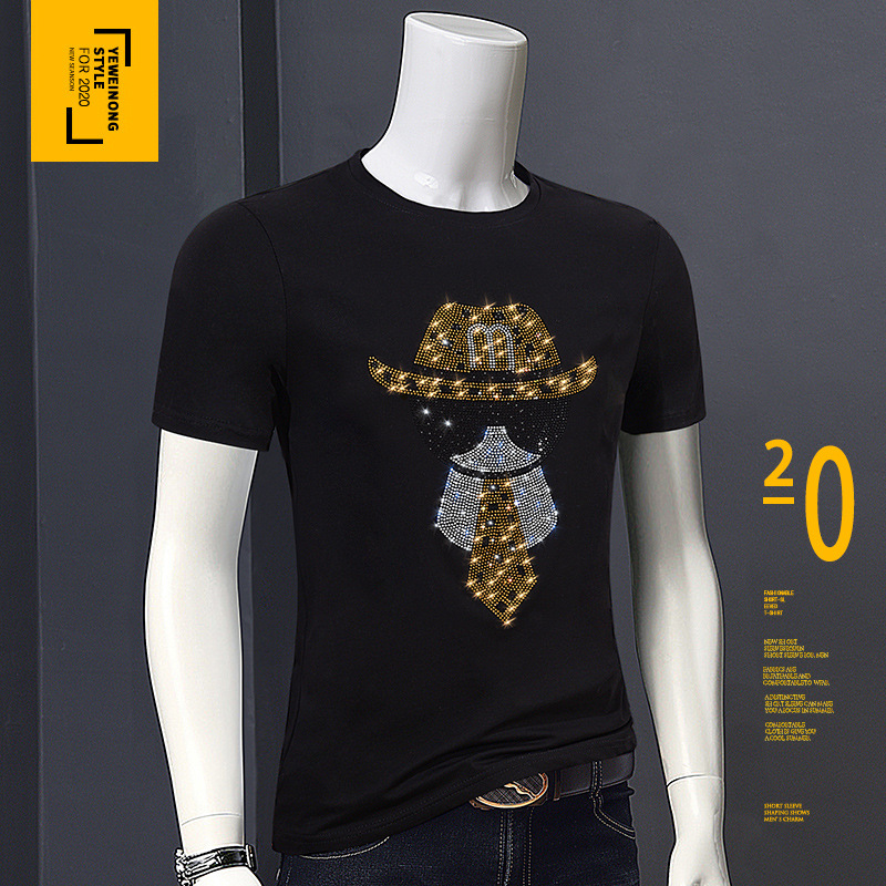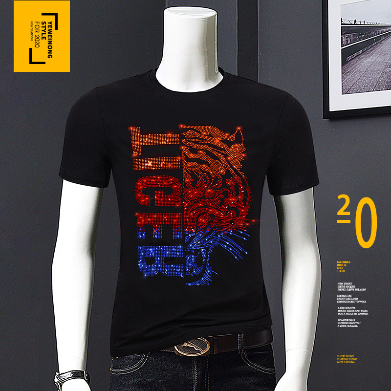 欧洲站夏季短袖t恤男潮流烫钻丝光棉冰丝时尚修身青年半袖打底衫