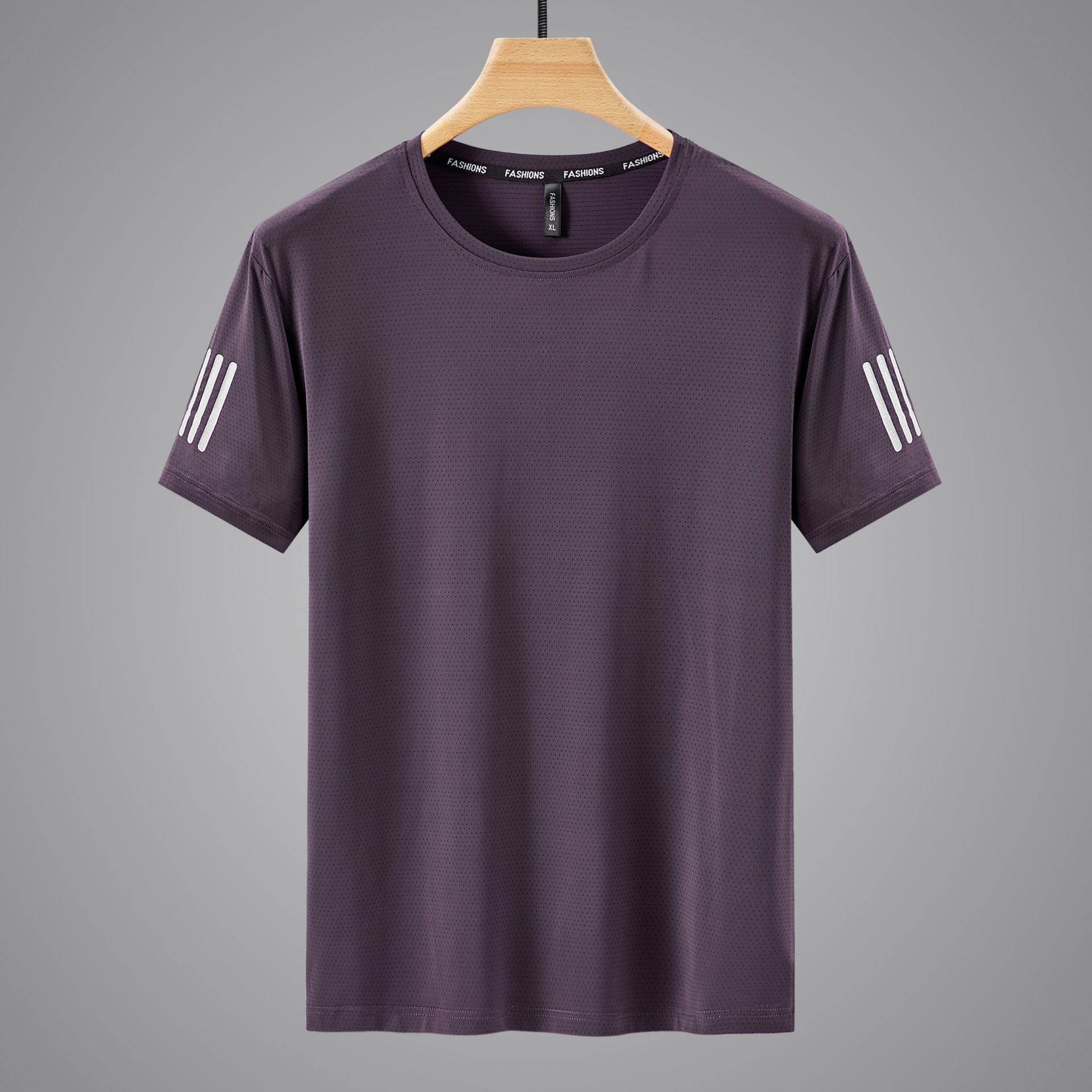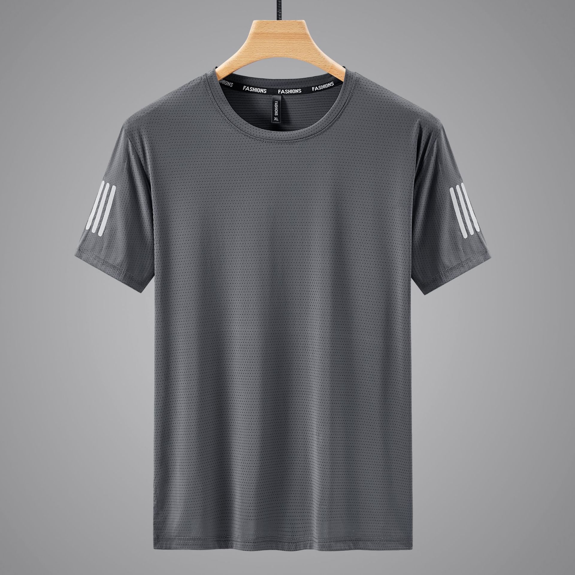 透气孔冰丝T恤男夏季速干短袖男圆领宽松高弹力速干衣三条杠T恤潮