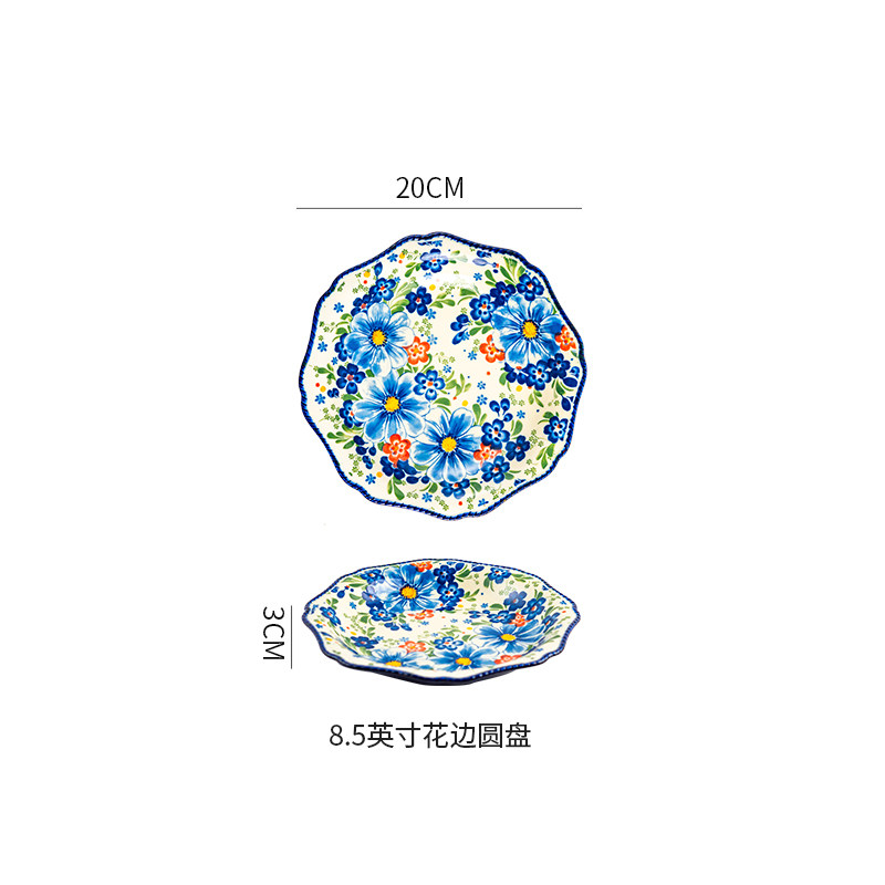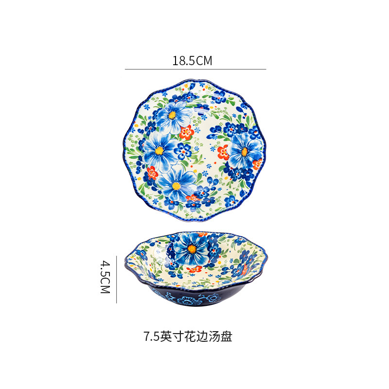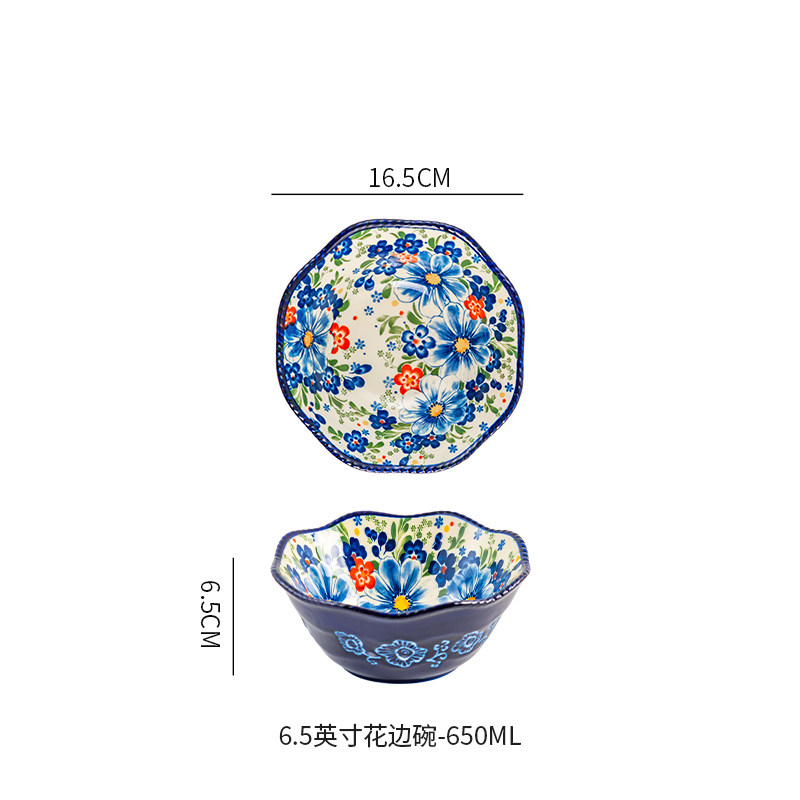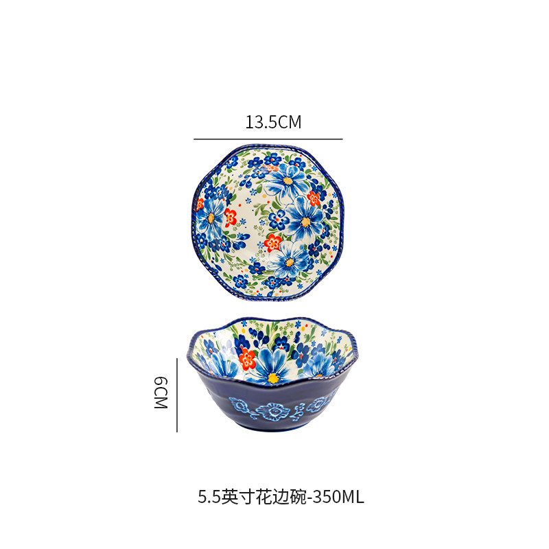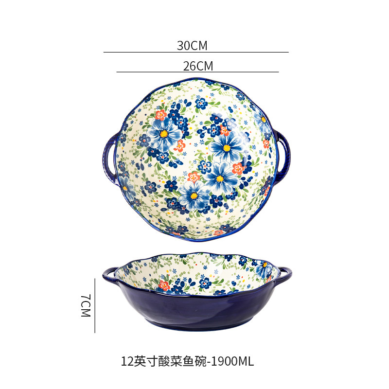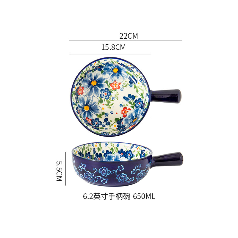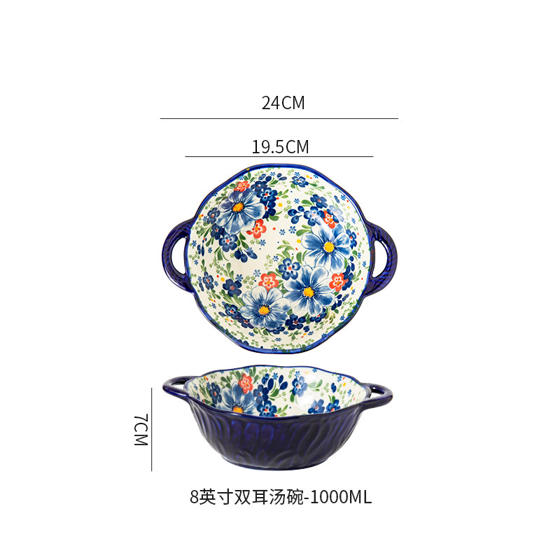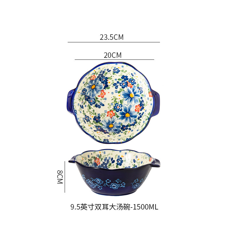 波兰彩釉下彩陶瓷碗碟家用复古米饭碗面碗双耳汤碗