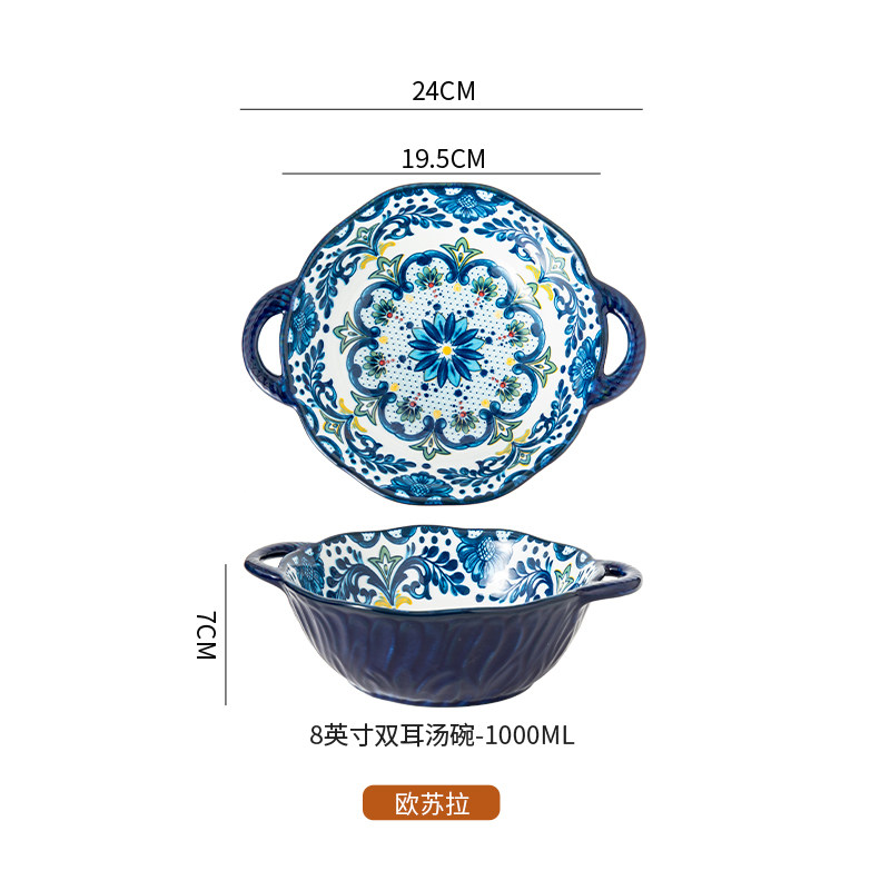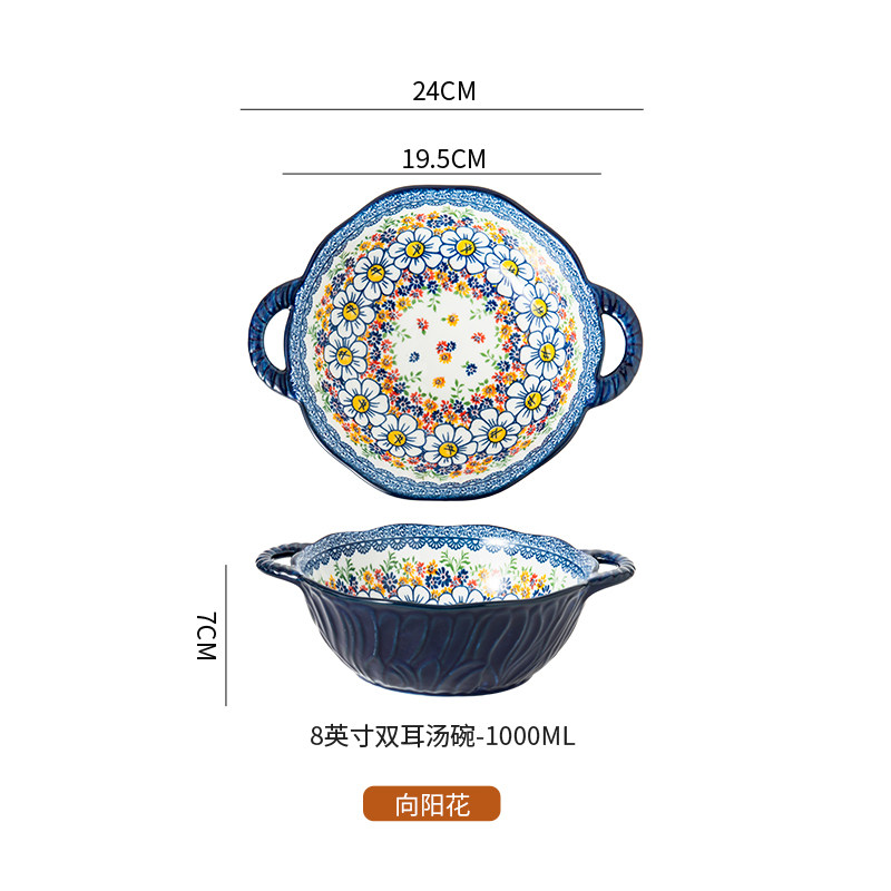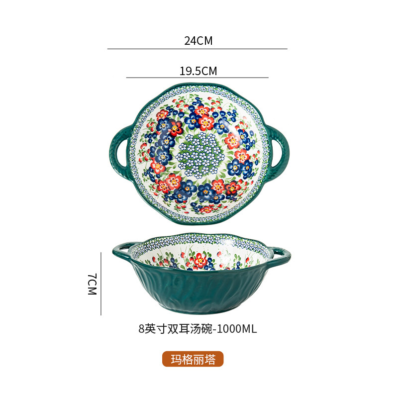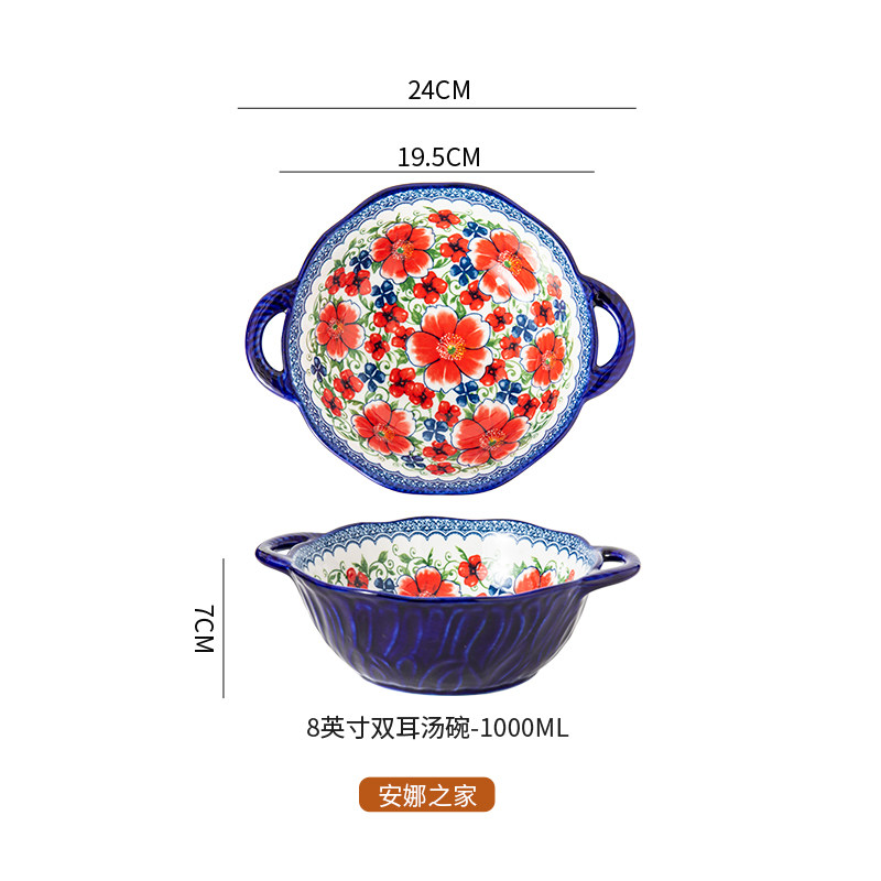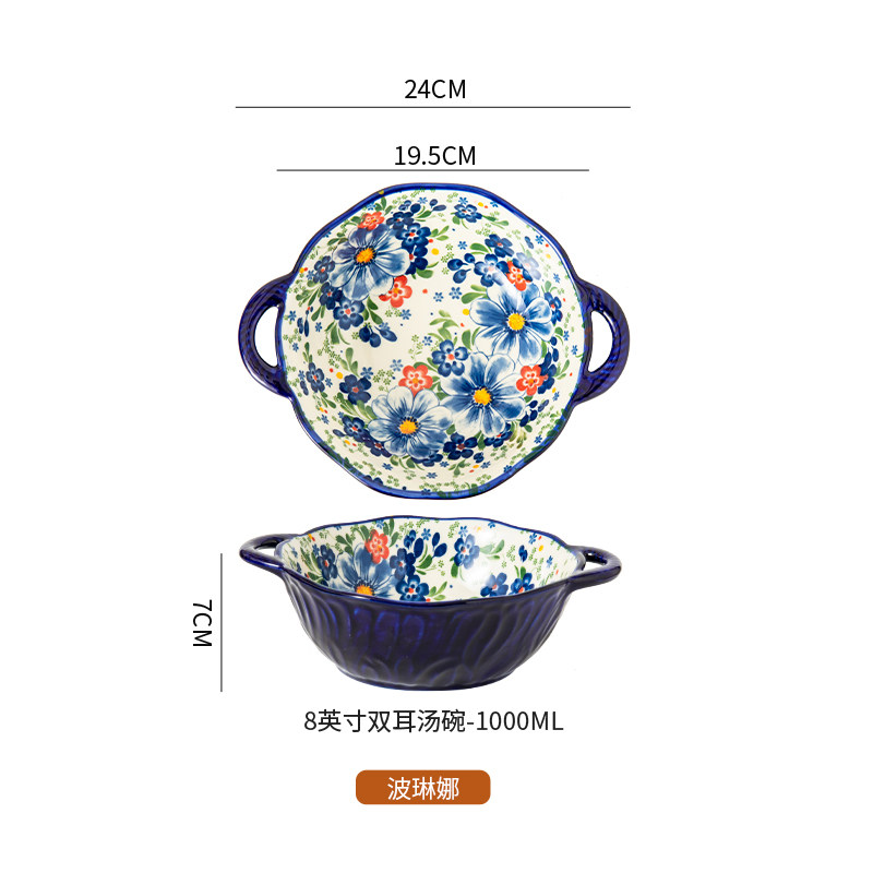 波兰彩双耳汤碗陶瓷大容量家用沙拉碗泡面碗螺蛳粉大碗