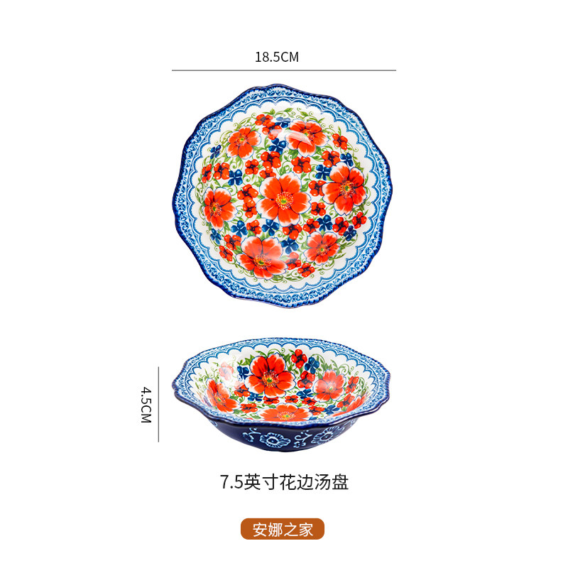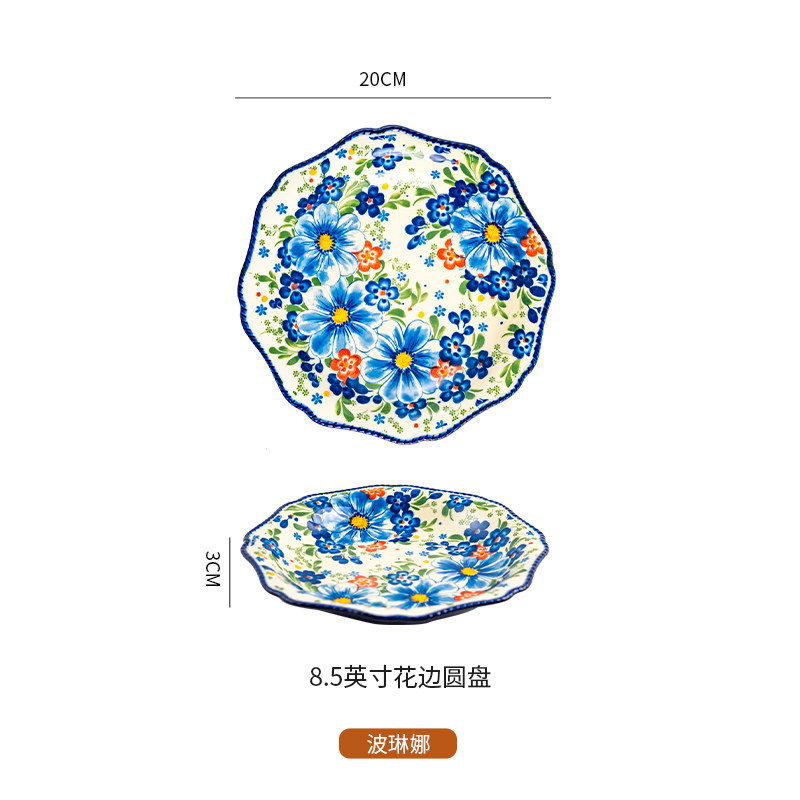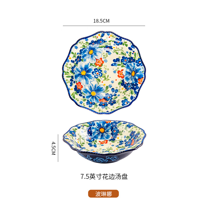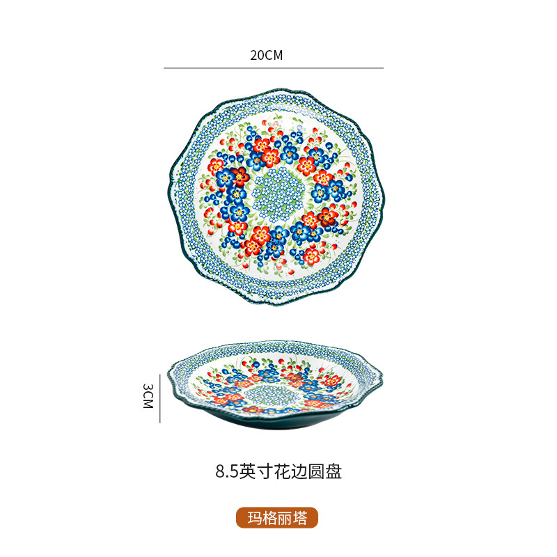 波兰风陶瓷8.5寸菜盘家用复古深盘早餐盘牛排盘水果盘