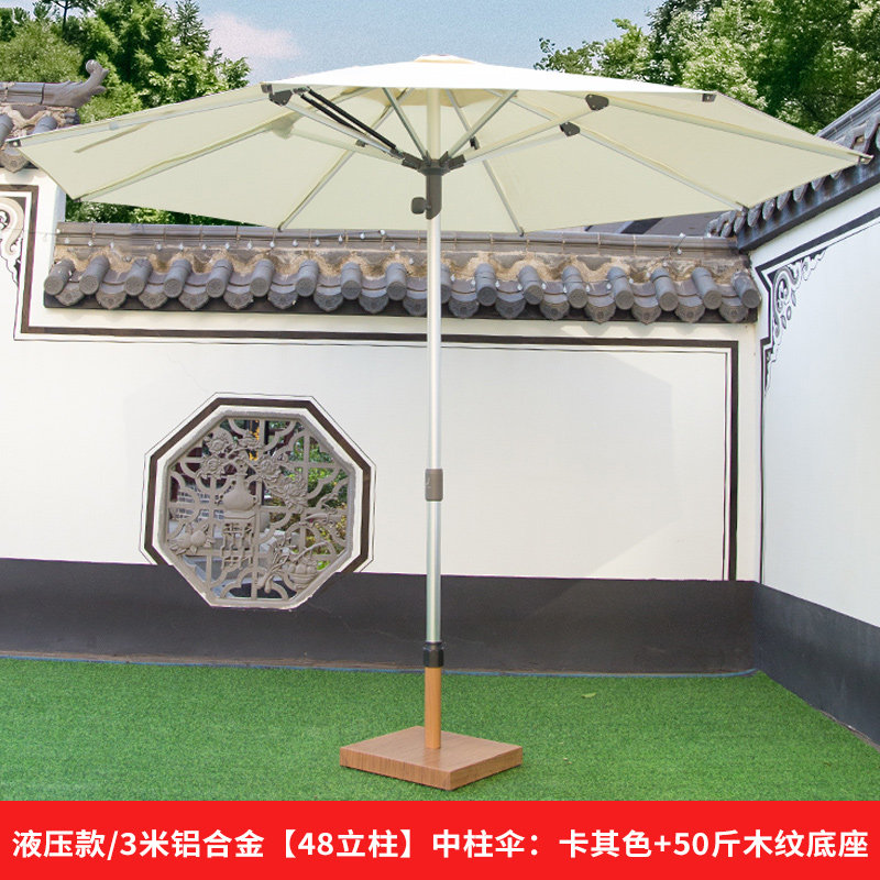 液压款/3米铝合金【48立柱】中柱伞:卡其色+50斤木纹底座