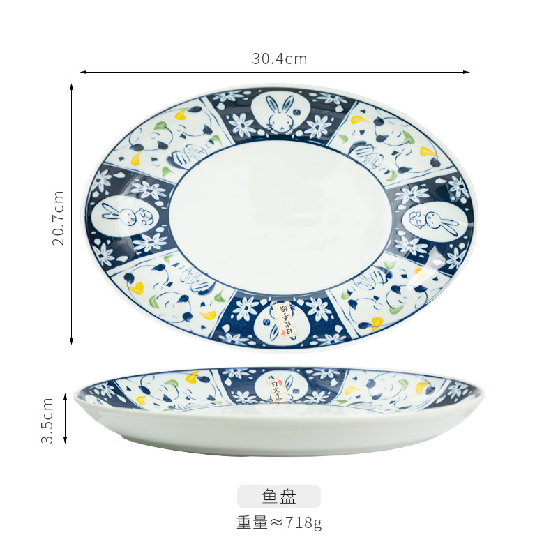日式手绘高温陶瓷复古祥瑞兔餐具家用椭圆鱼盘菜盘