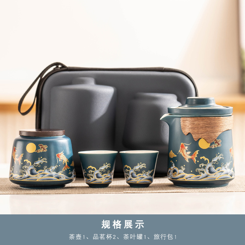 草木灰《锦鲤报福》一壶四杯旅行茶具+茶叶罐+主人杯-礼盒装