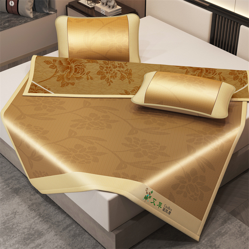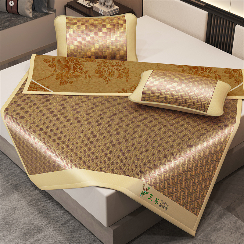 2024新款夏季艾草古藤冰丝凉席套件双面宽边绣花藤席软席批发代发