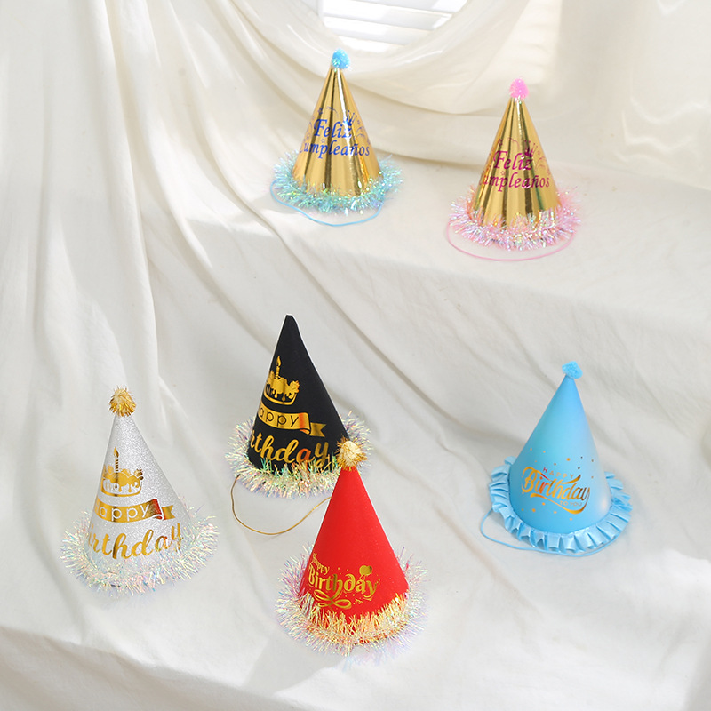 英文烫金印花儿童生日帽可爱毛绒球装饰尖顶帽白卡纸帽厂家批发