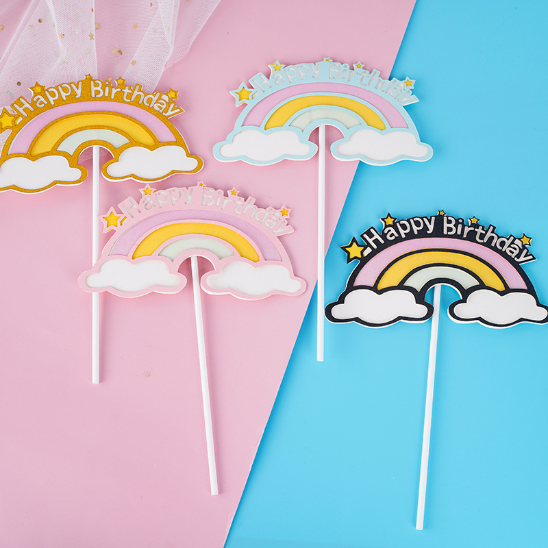双层彩虹云朵蛋糕插牌马卡龙色甜点装饰英文生日快乐烘焙蛋糕插件