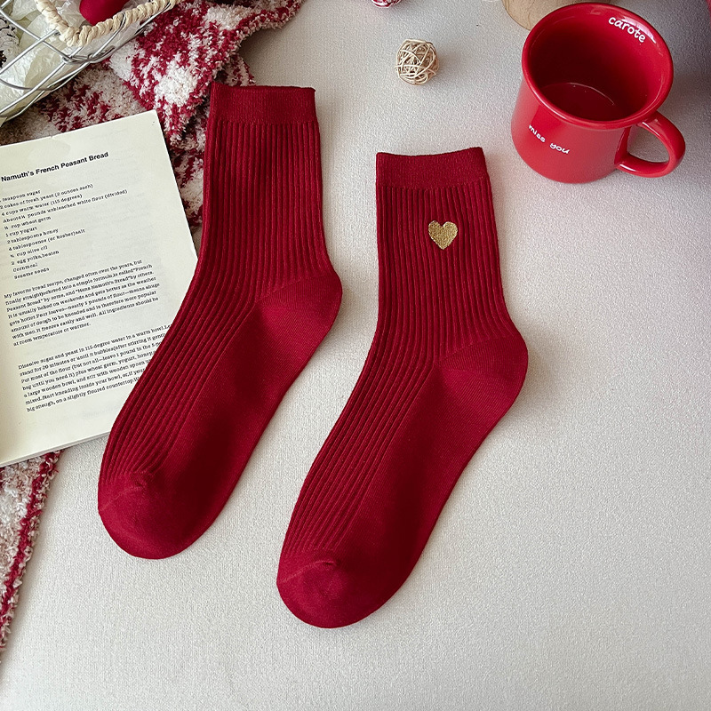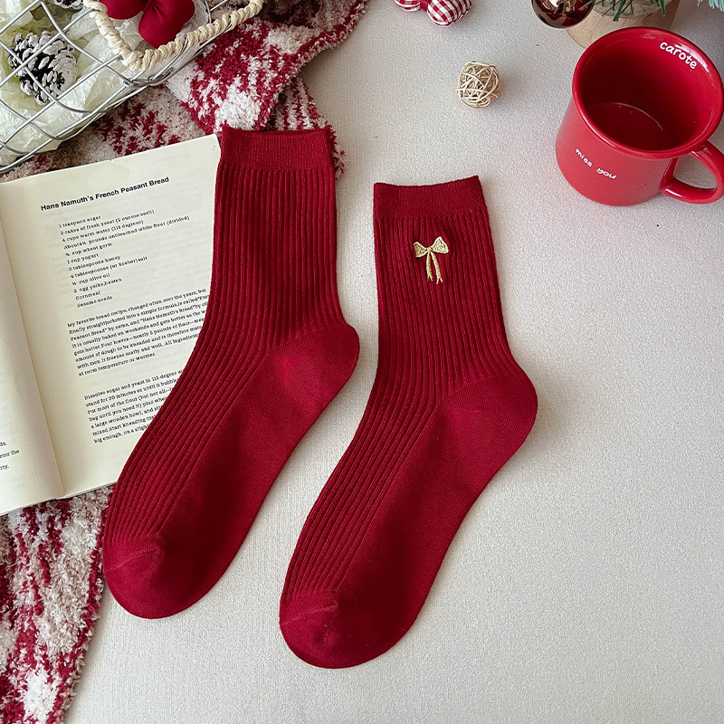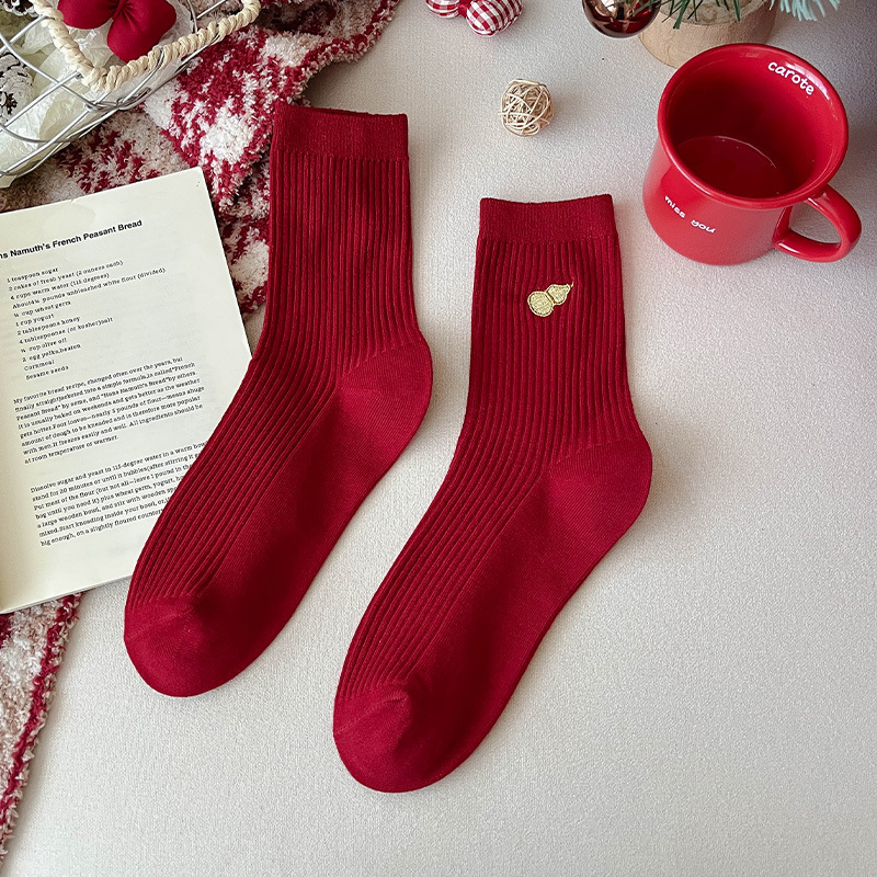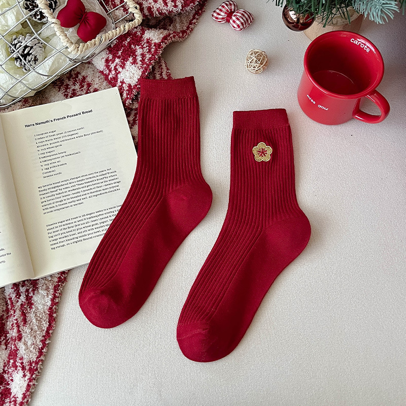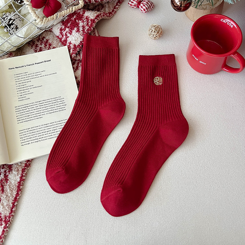 马年袜子女新款2026本命年袜子棉袜卡通刺绣双针中筒袜女红色袜子