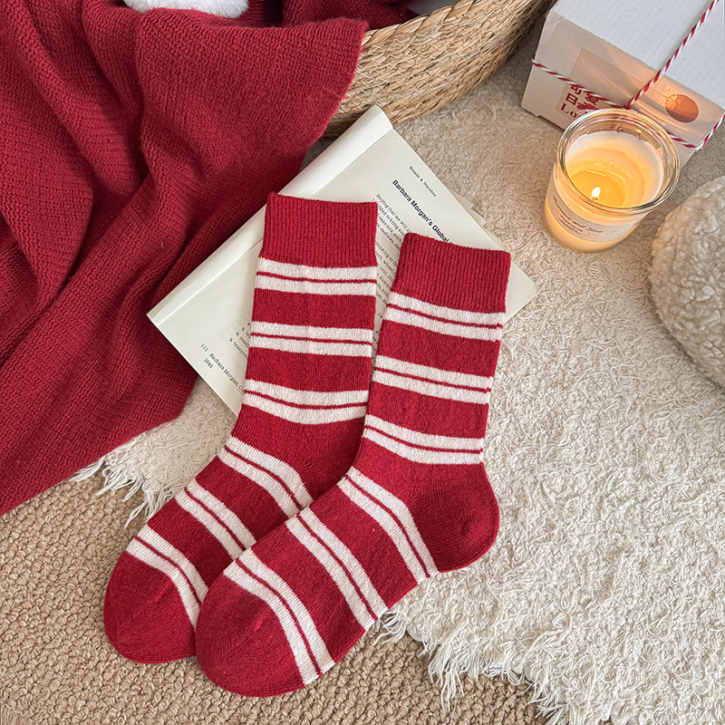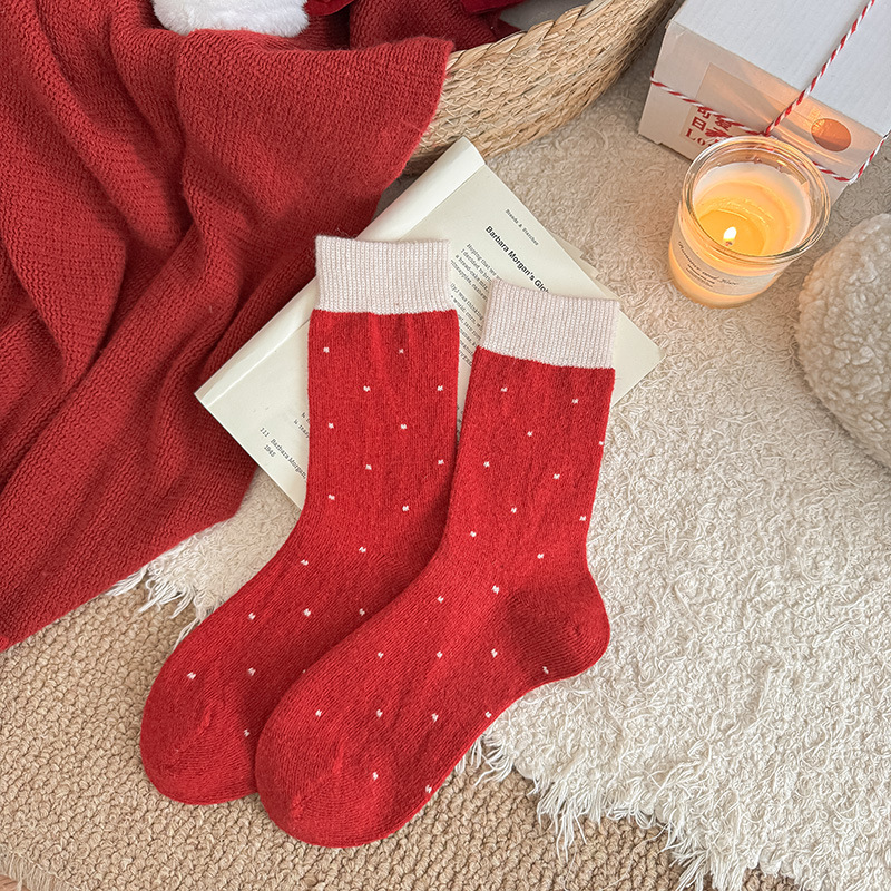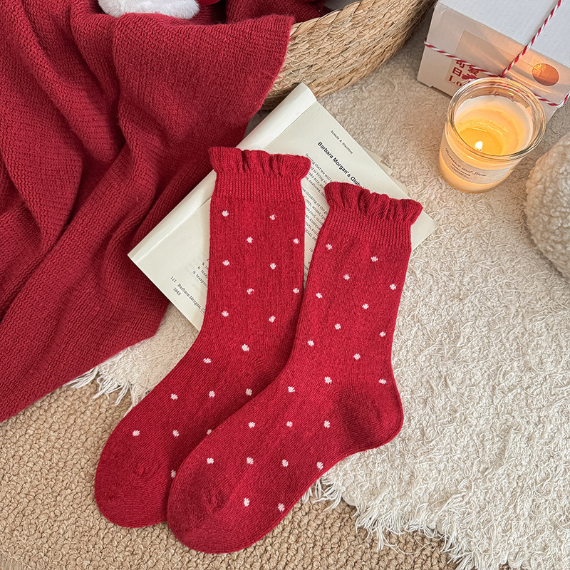 本命年红色袜子女甜美蝴蝶结花边中筒袜日系波点条纹加厚羊毛袜子