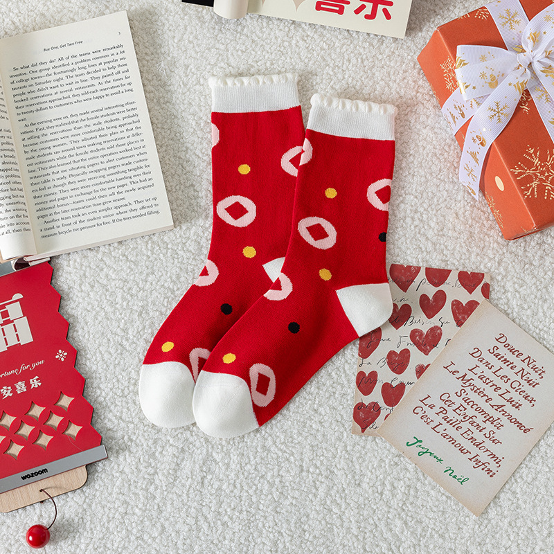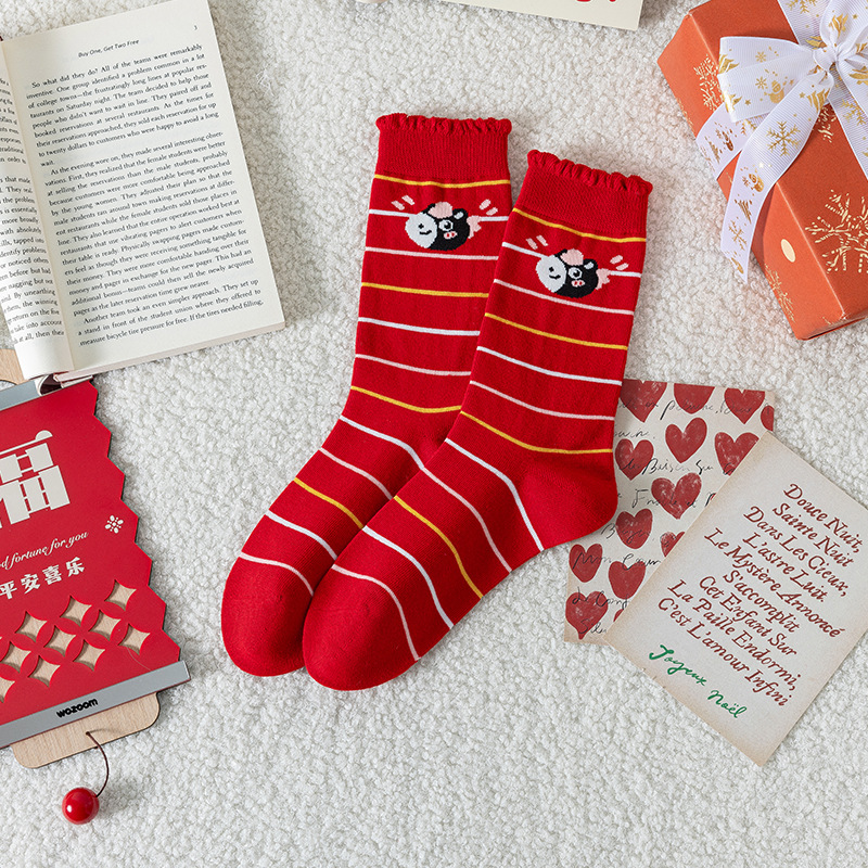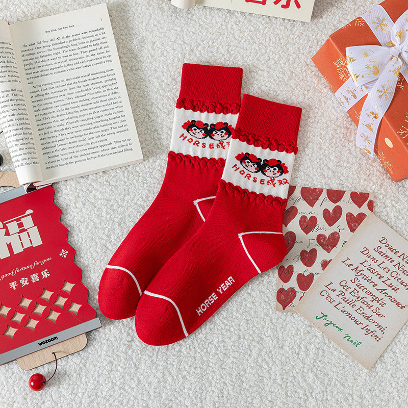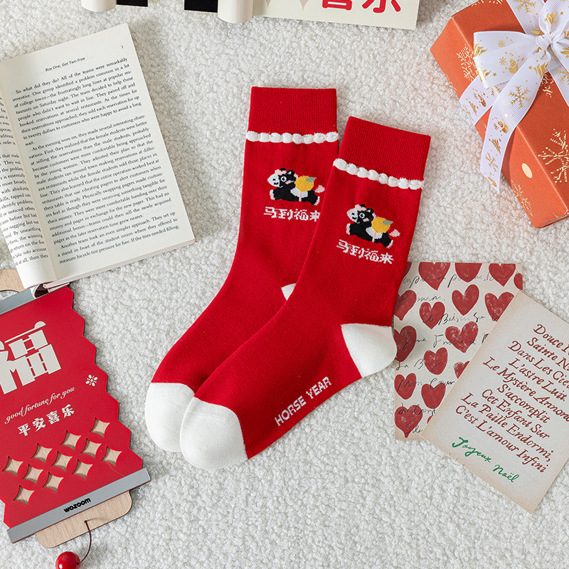 马年本命年袜子女可爱卡通小黑马中筒袜百搭条纹精梳棉新年鸿运袜