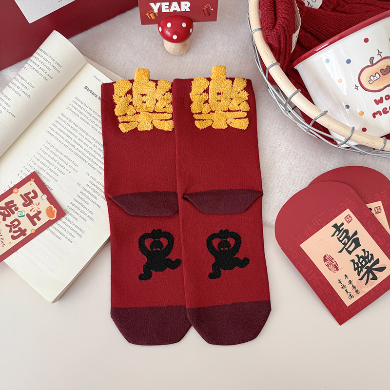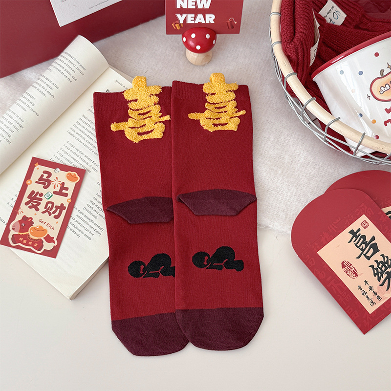 马上有钱本命年袜子女2026新款马年红色袜子植绒立体喜乐发财袜子