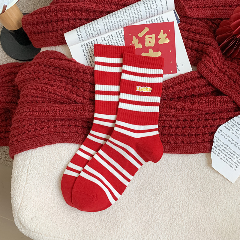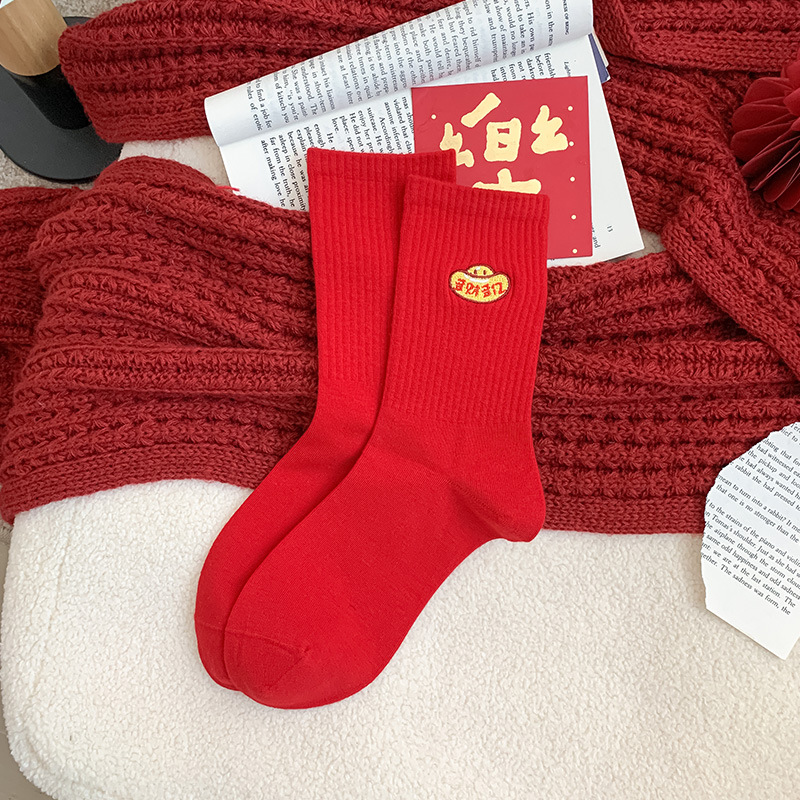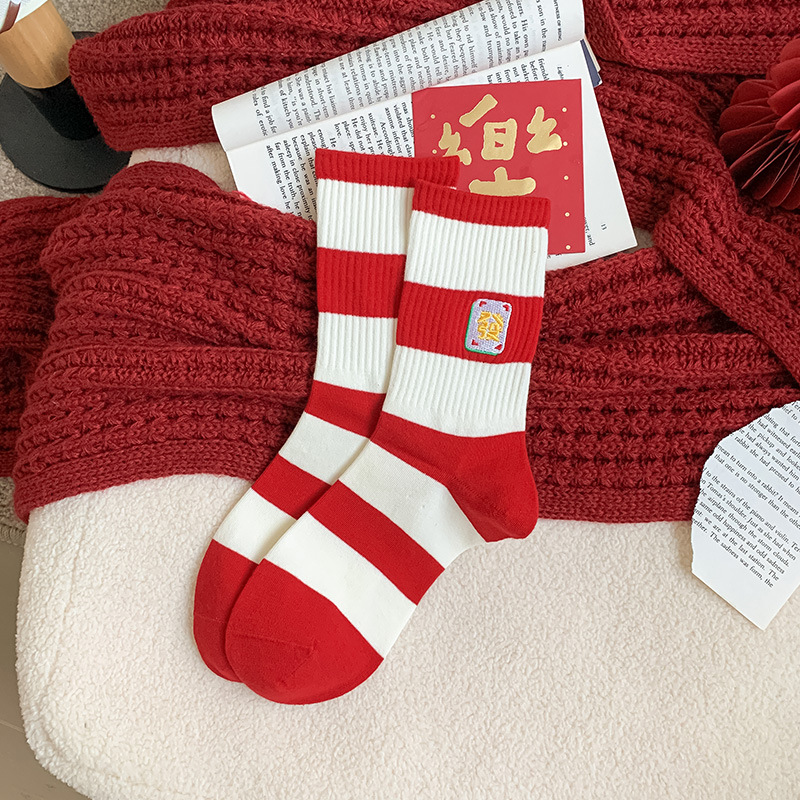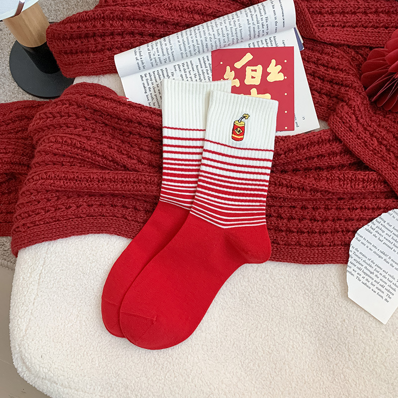 红袜子女中筒袜无骨卡通刺绣本命年袜子条纹时尚百搭精梳棉过年袜
