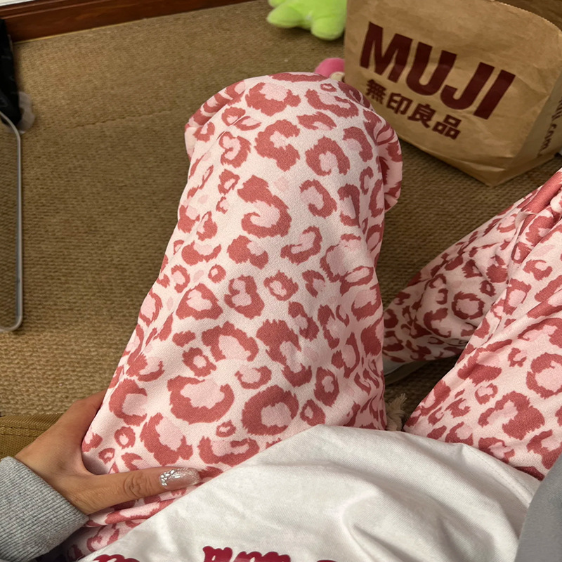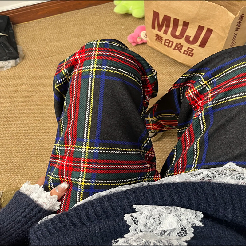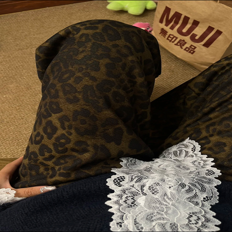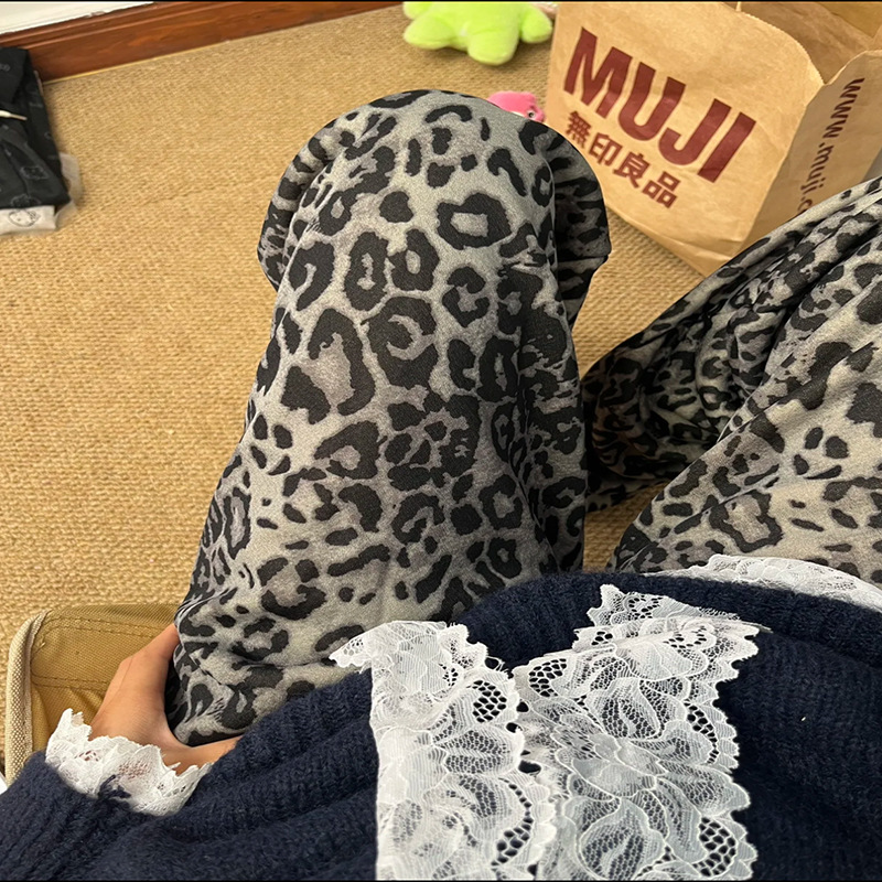 有口袋贝贝绒格子裤豹纹阔腿裤垂坠感秋冬季加绒加厚休闲直筒裤子