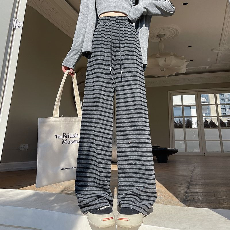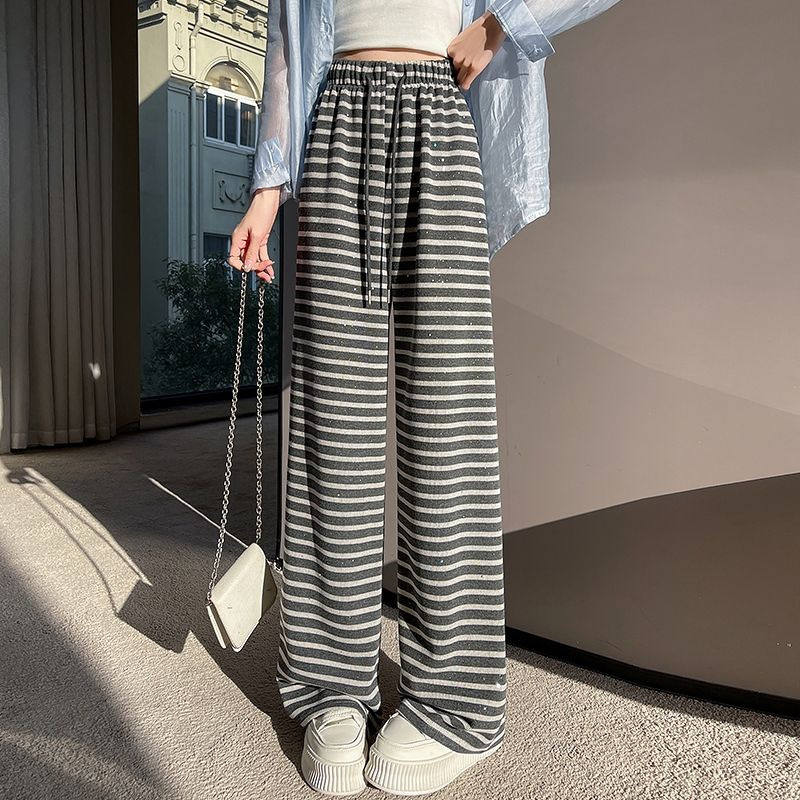 【显高显瘦】新款网红横条奶芙绒阔腿裤爆款高腰时尚条纹裤阔腿裤