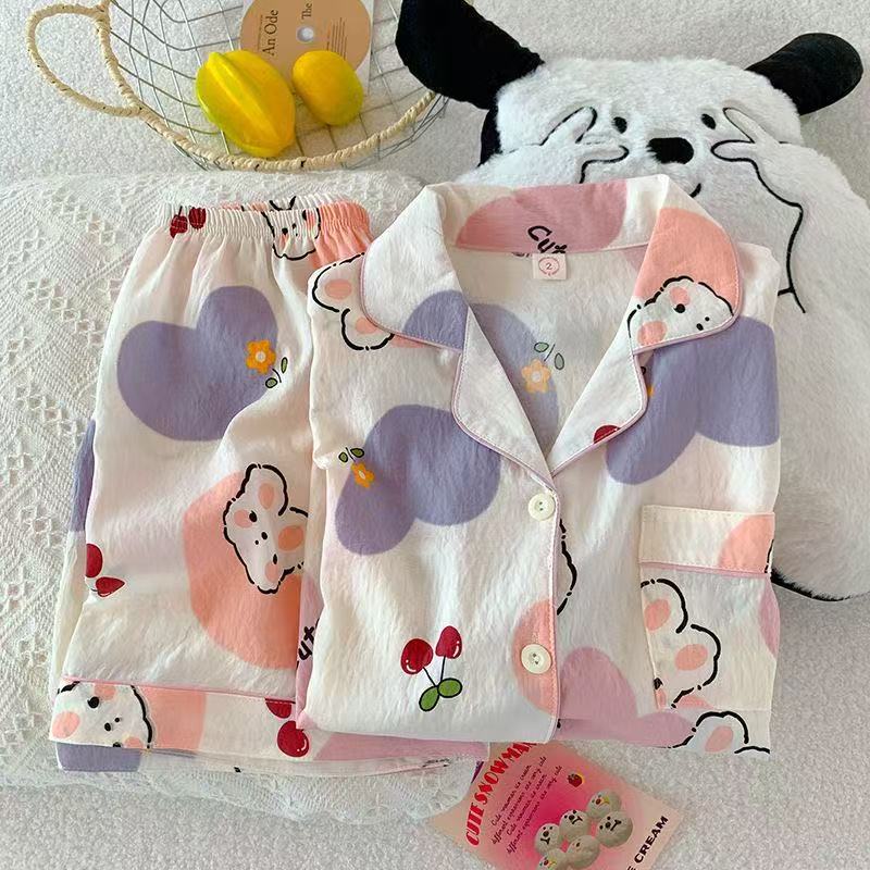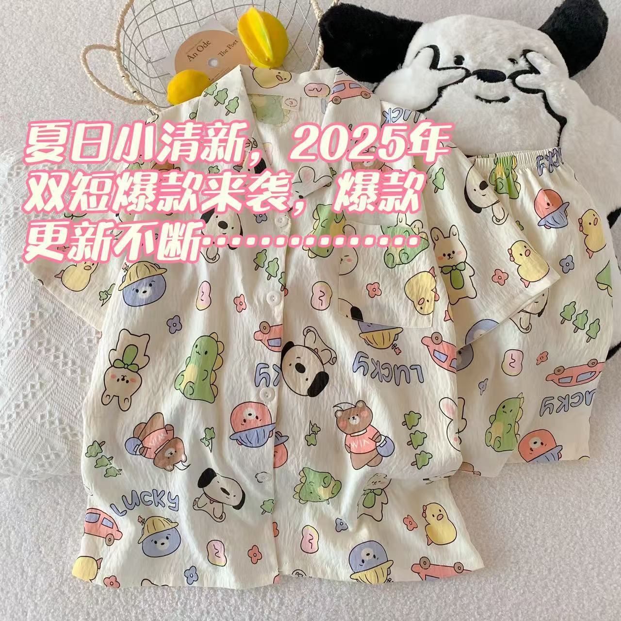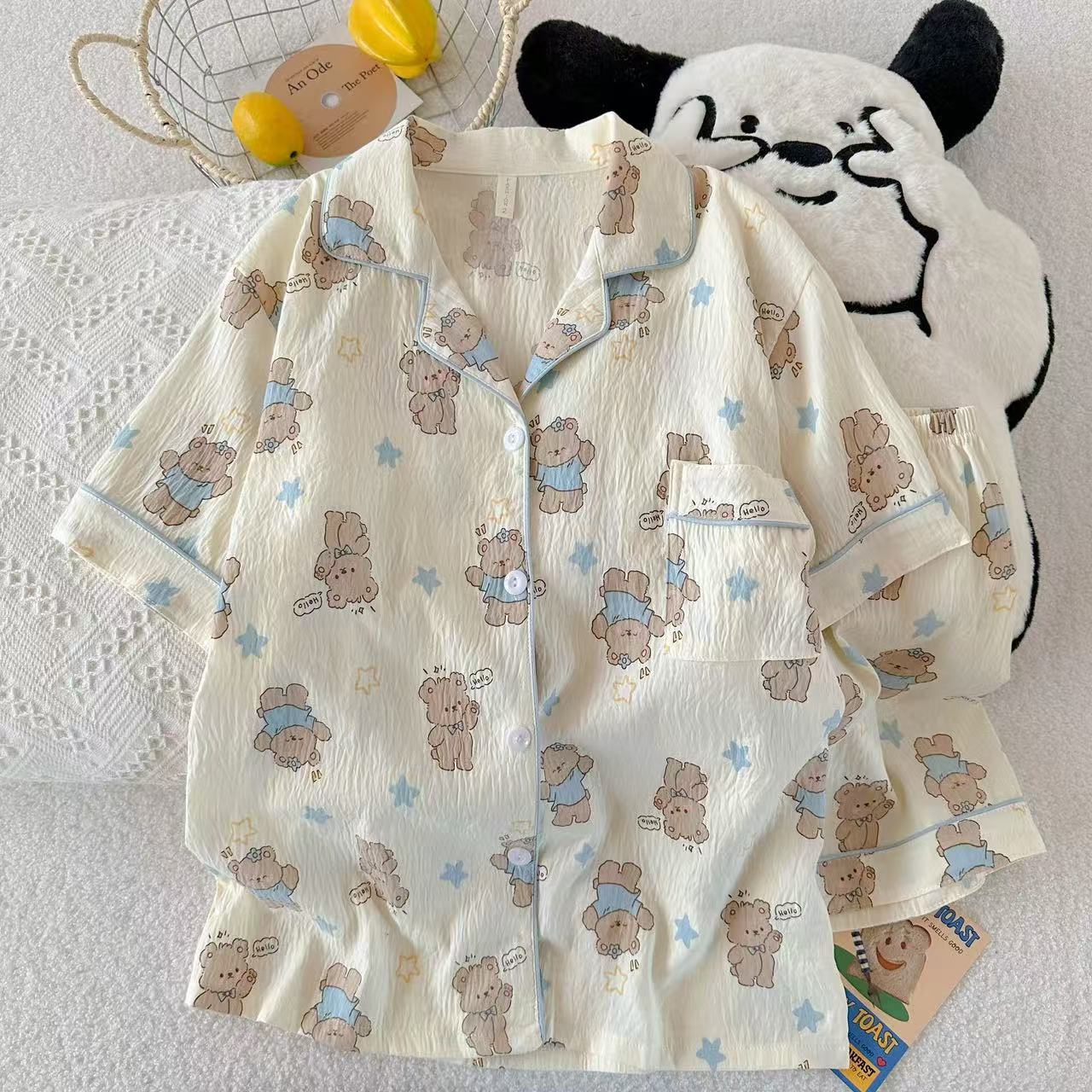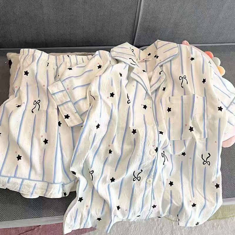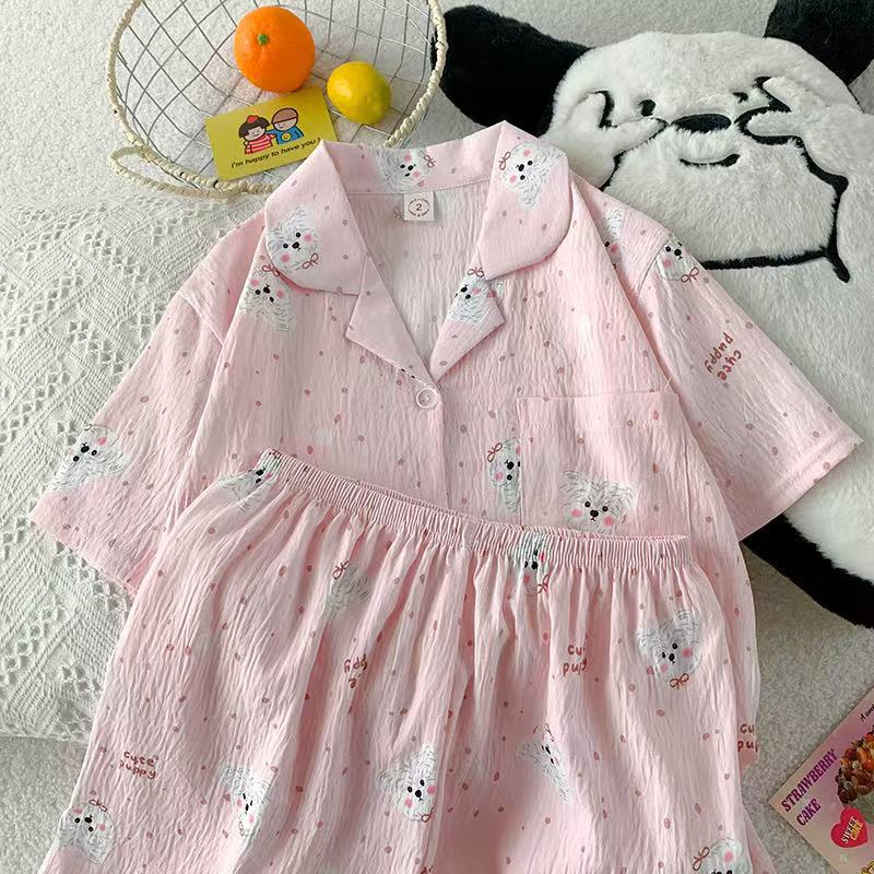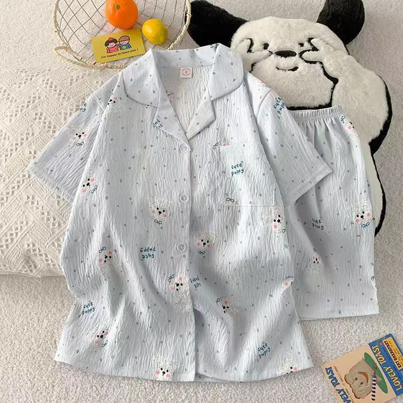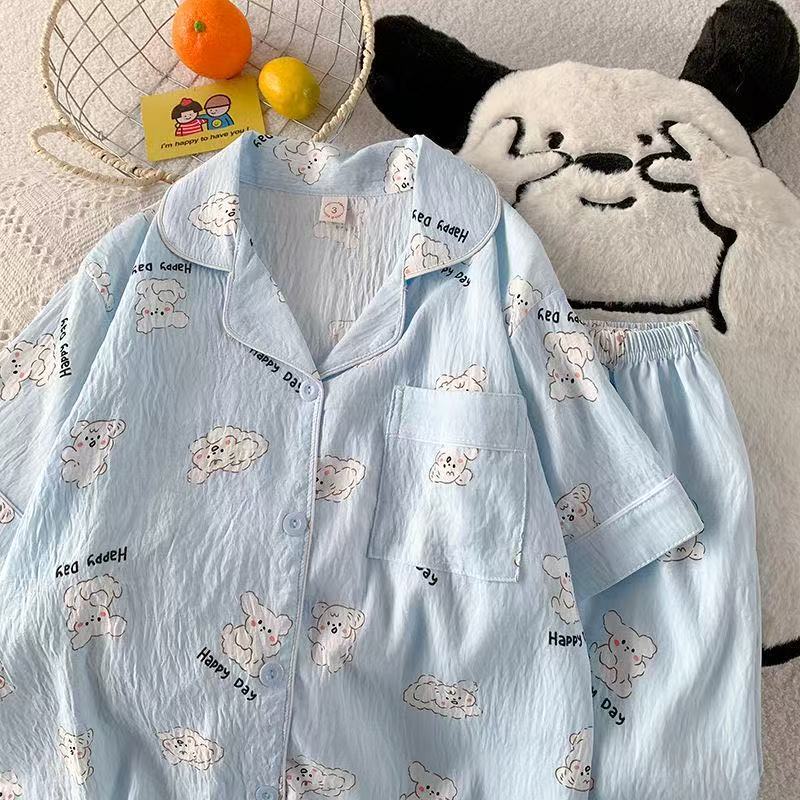 工厂现货夏季云朵棉翻领开衫小熊短袖短裤睡衣女套装休闲家居服