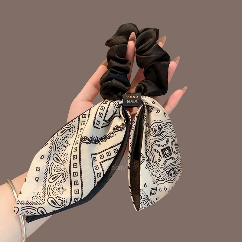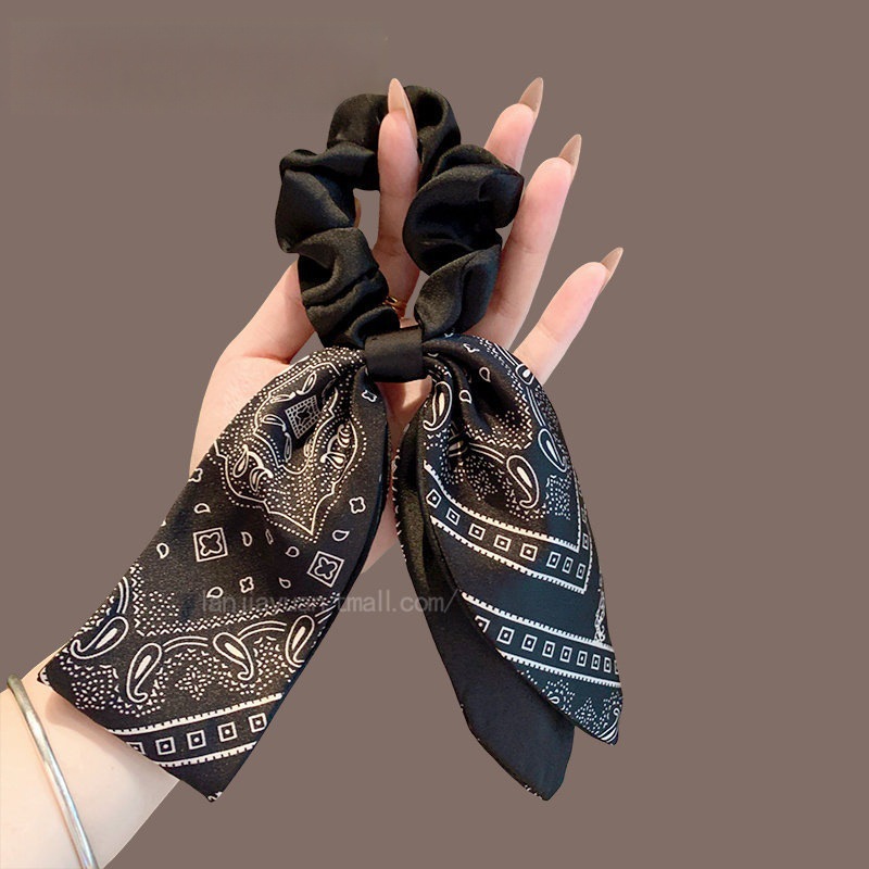 法式高级感印花缎面肥肠圈时尚气质蝴蝶结飘带头绳简约百搭发绳女