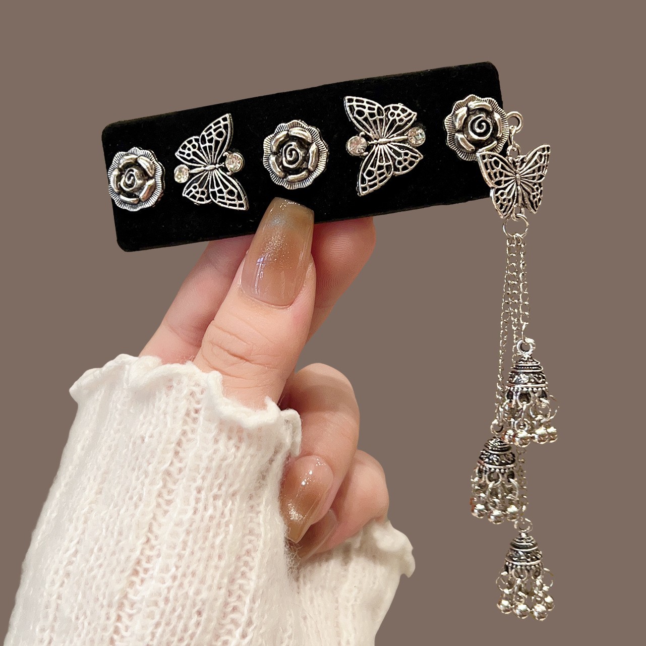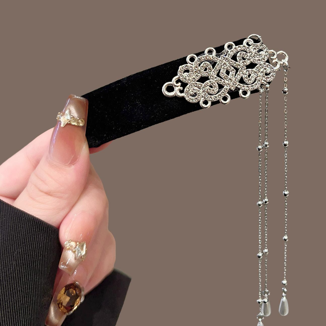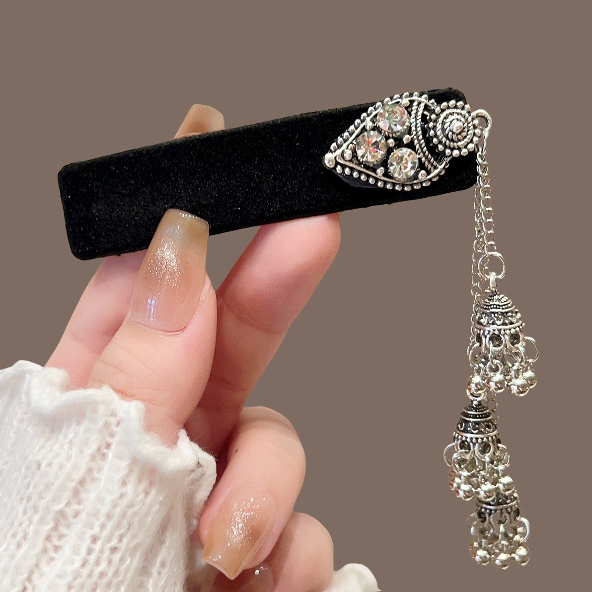 黑色丝绒银铃流苏BB夹