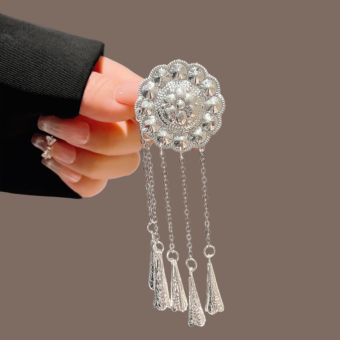 银色水钻方形花朵流苏一字夹