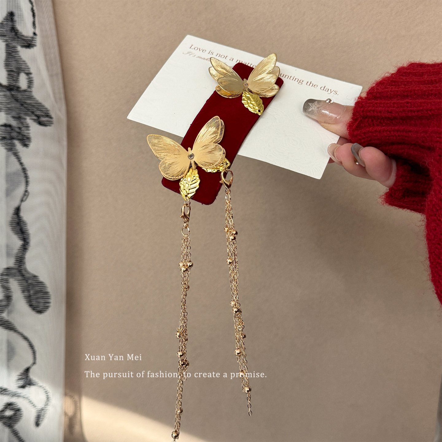 红色丝绒方形双蝶流苏BB夹