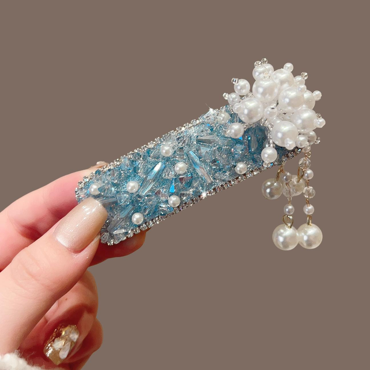 蓝色水晶钻珍珠花朵流苏BB夹