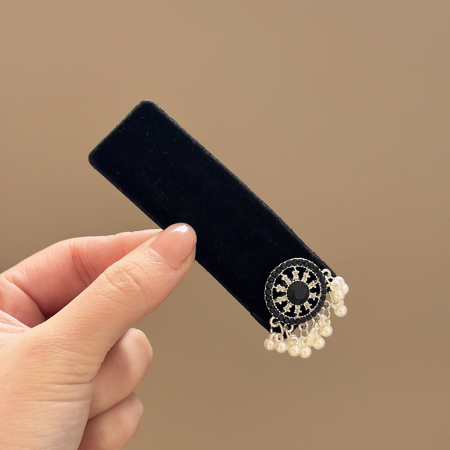 黑色植绒方形珍珠流苏BB夹