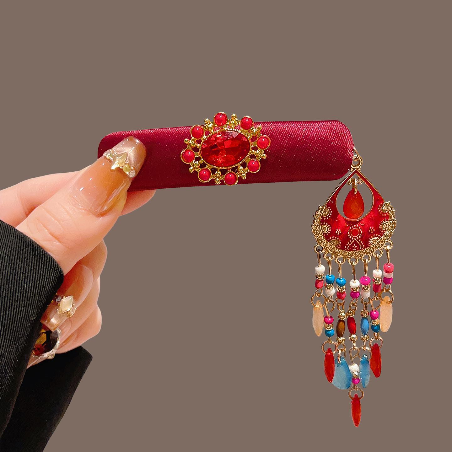 红色丝绒水晶流苏BB夹