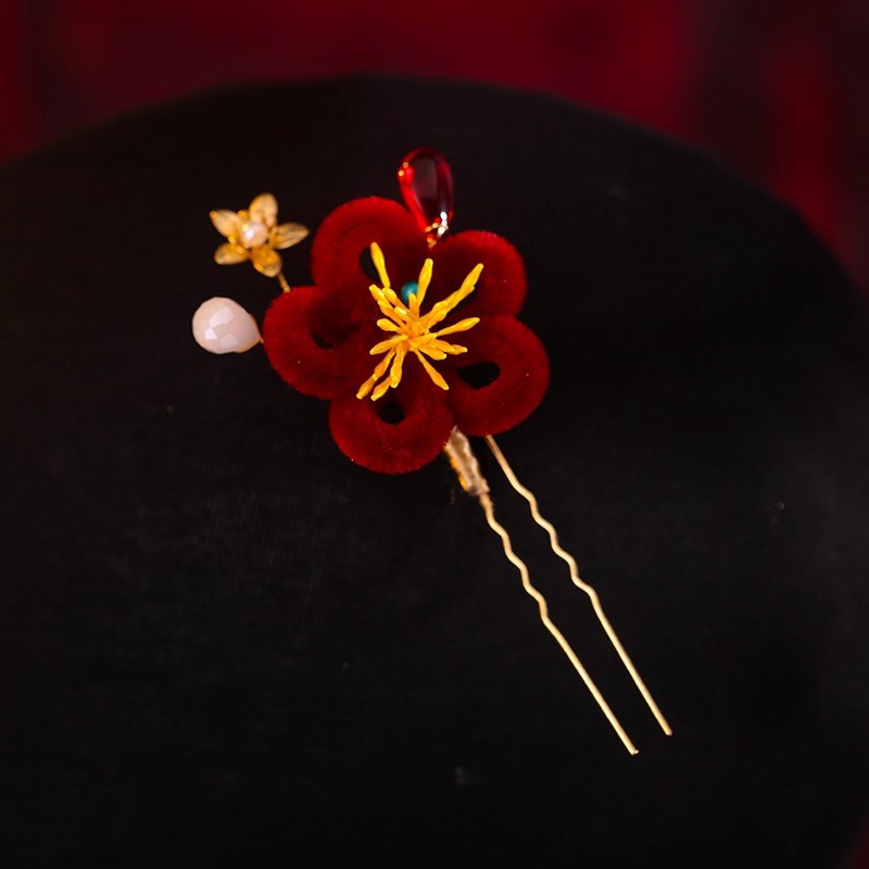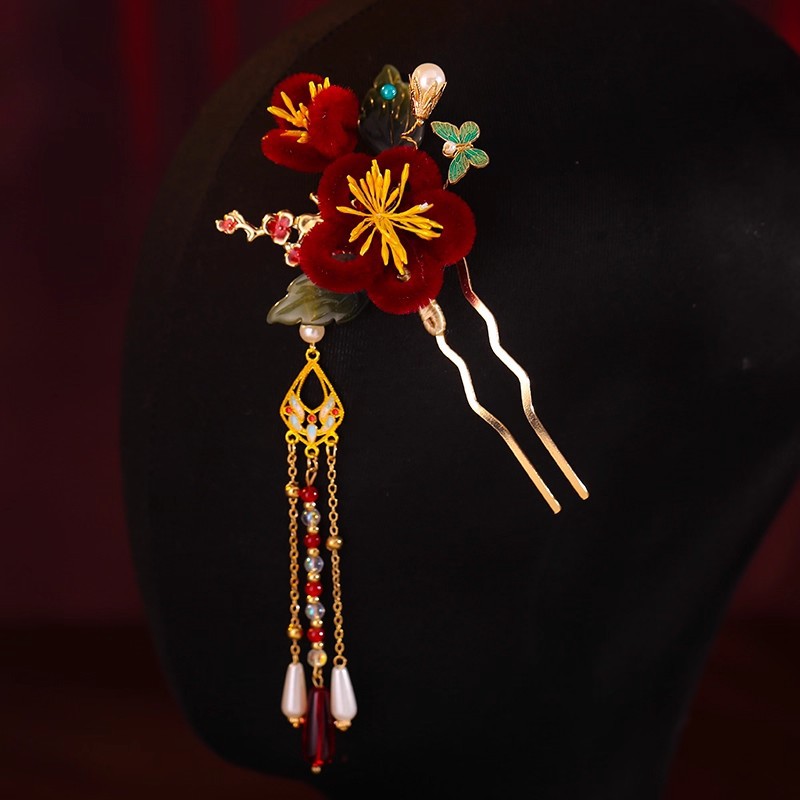 厂家直销红色绒花发簪流苏步摇套装马面裙配饰头饰汉服古风头饰