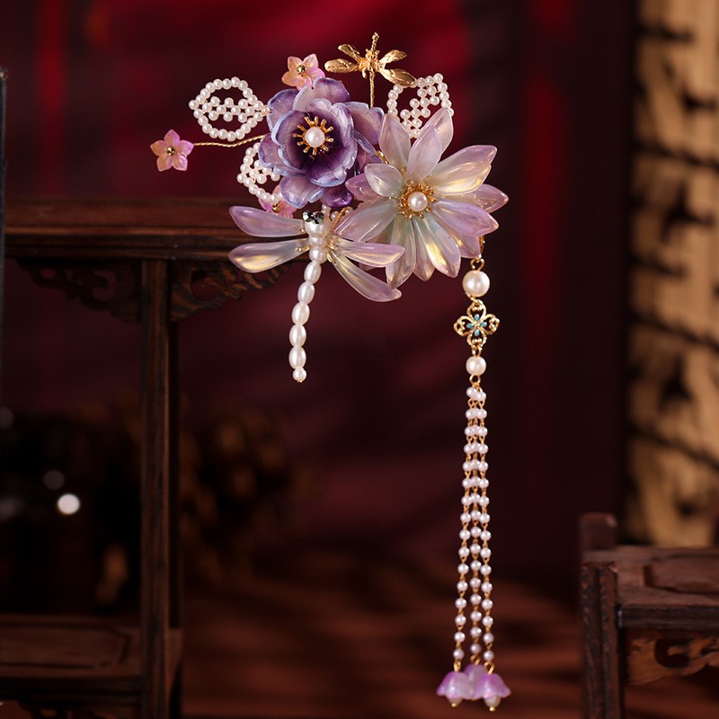 超仙古装汉服蜻蜓边夹古风花朵汉服配饰发夹头饰流苏夹子少女发饰