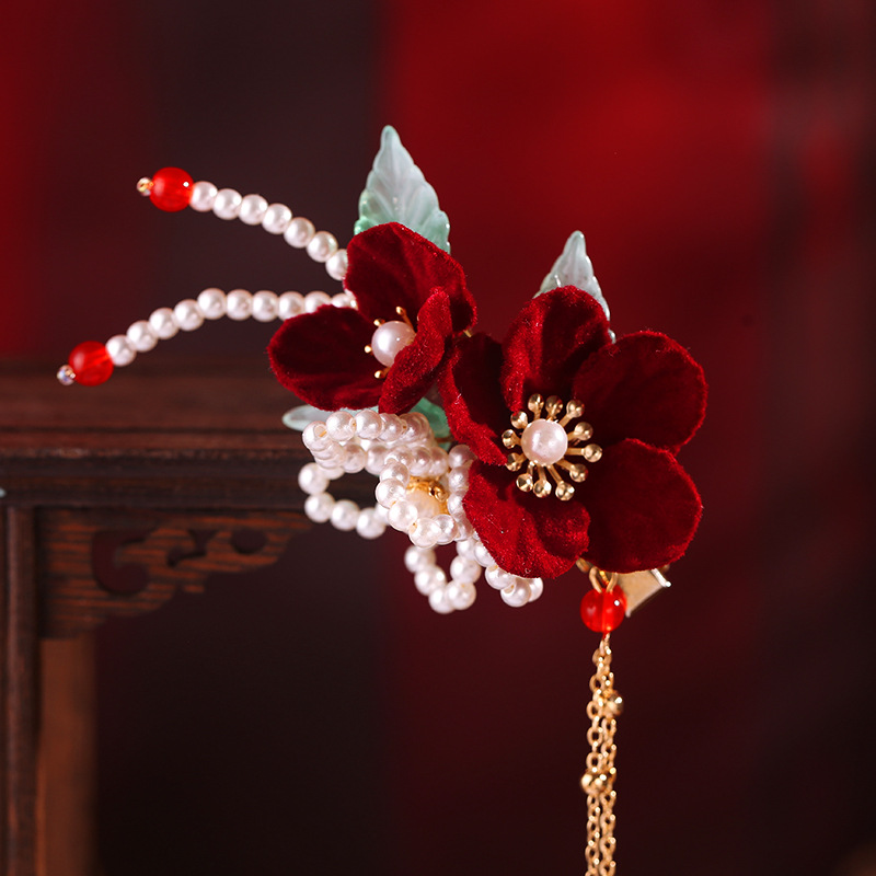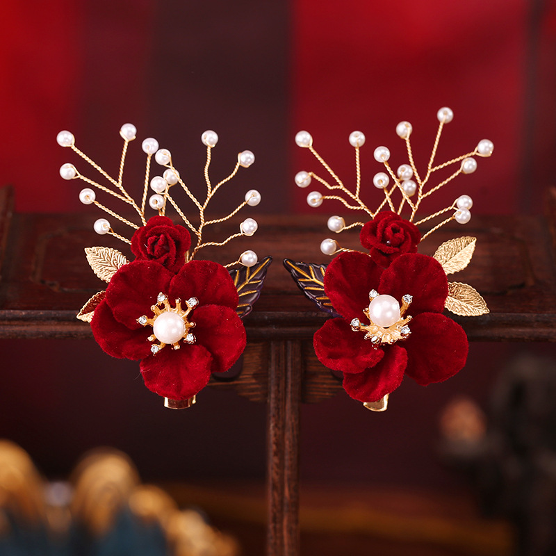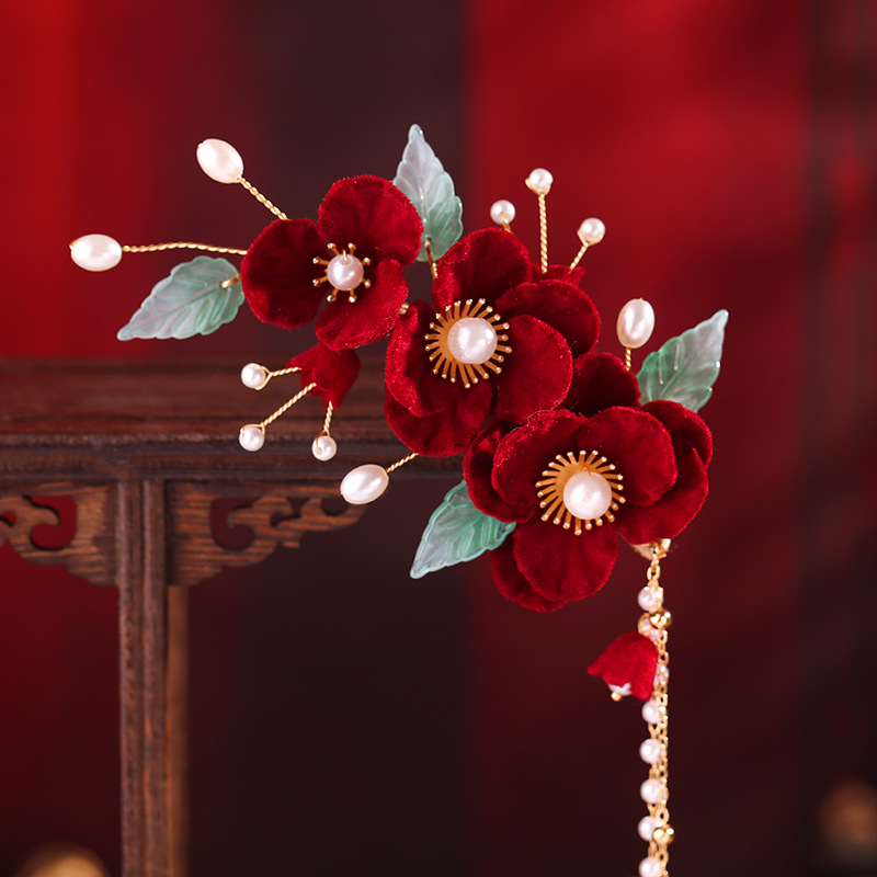 古风红色绒花边夹汉服新娘头饰全套发夹珍珠流苏简约百搭喜庆花朵