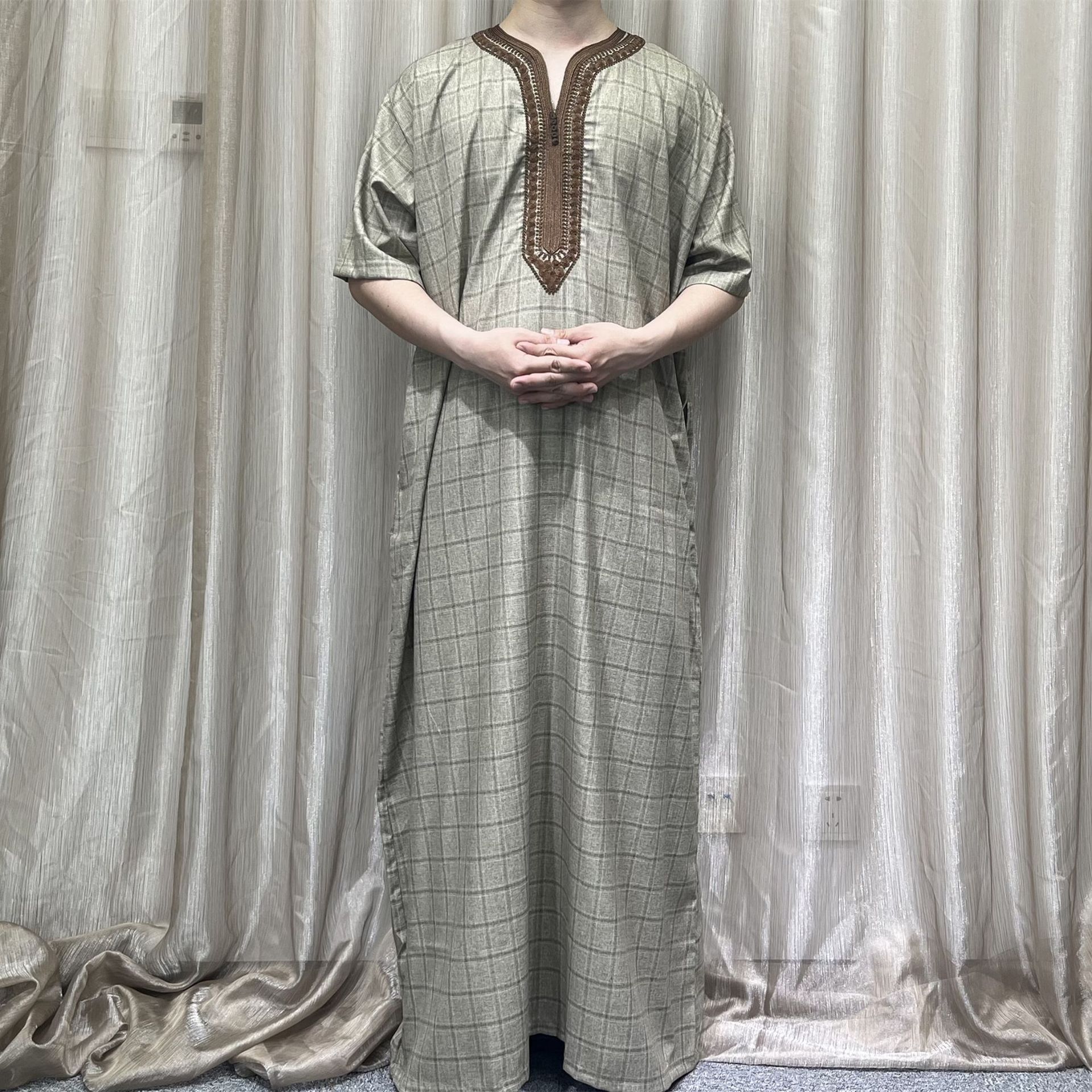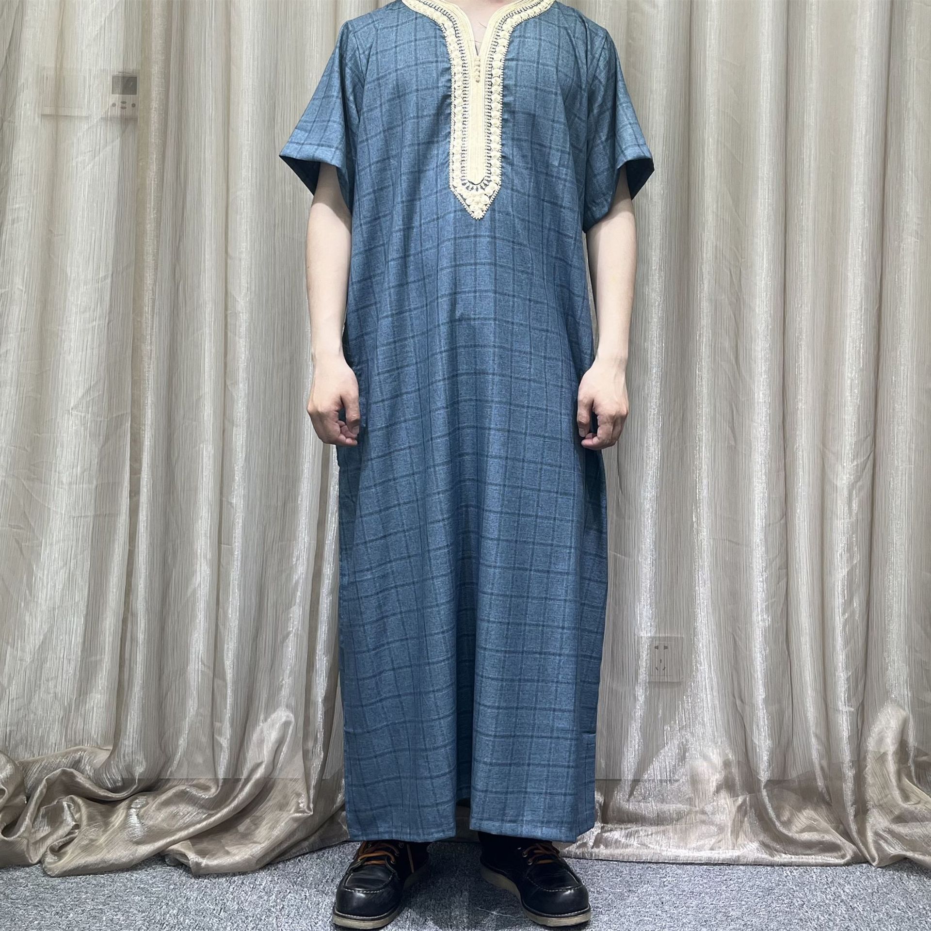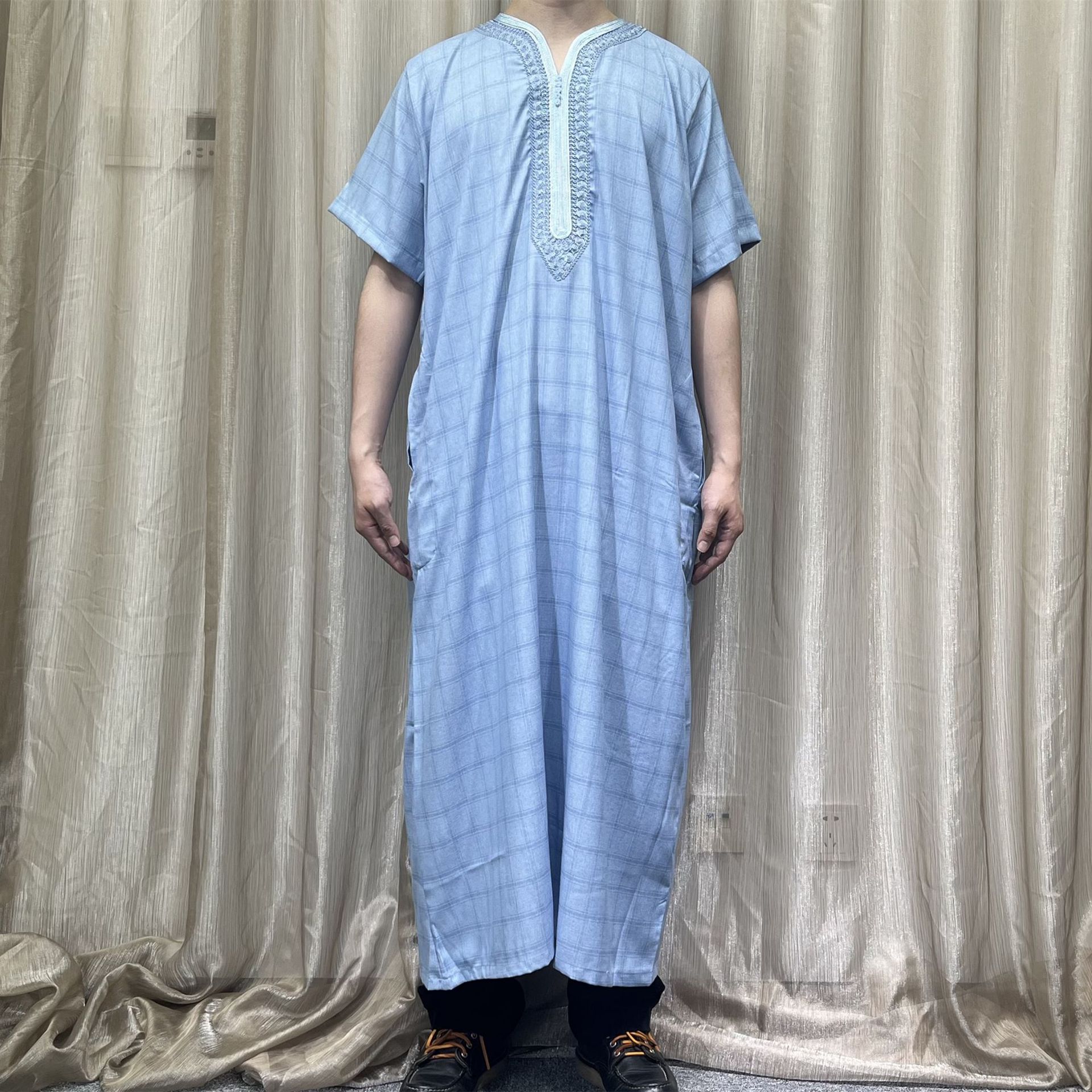 2025跨境高质量人棉海外热销摩洛哥袍精美绣花格子纹路带口袋现货
