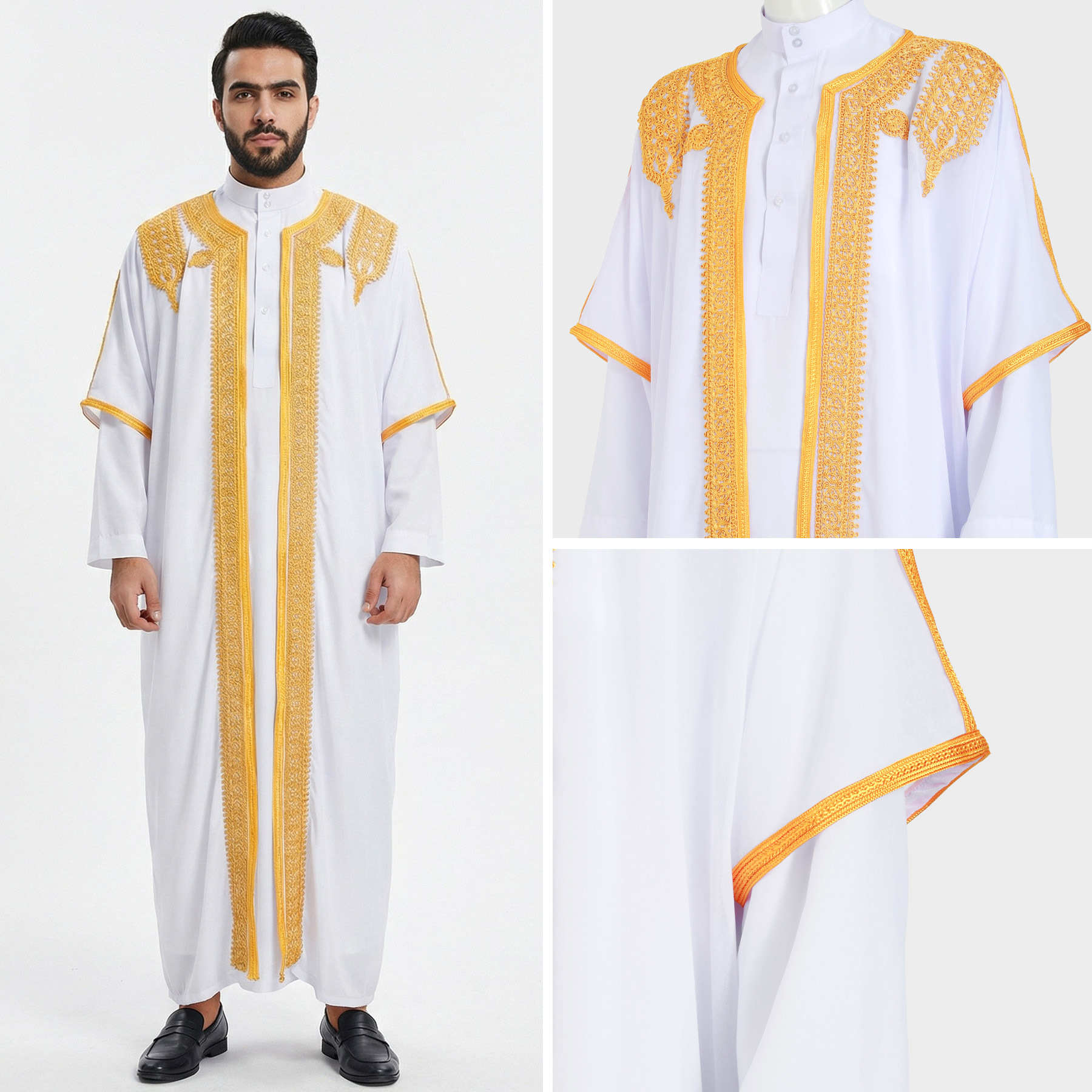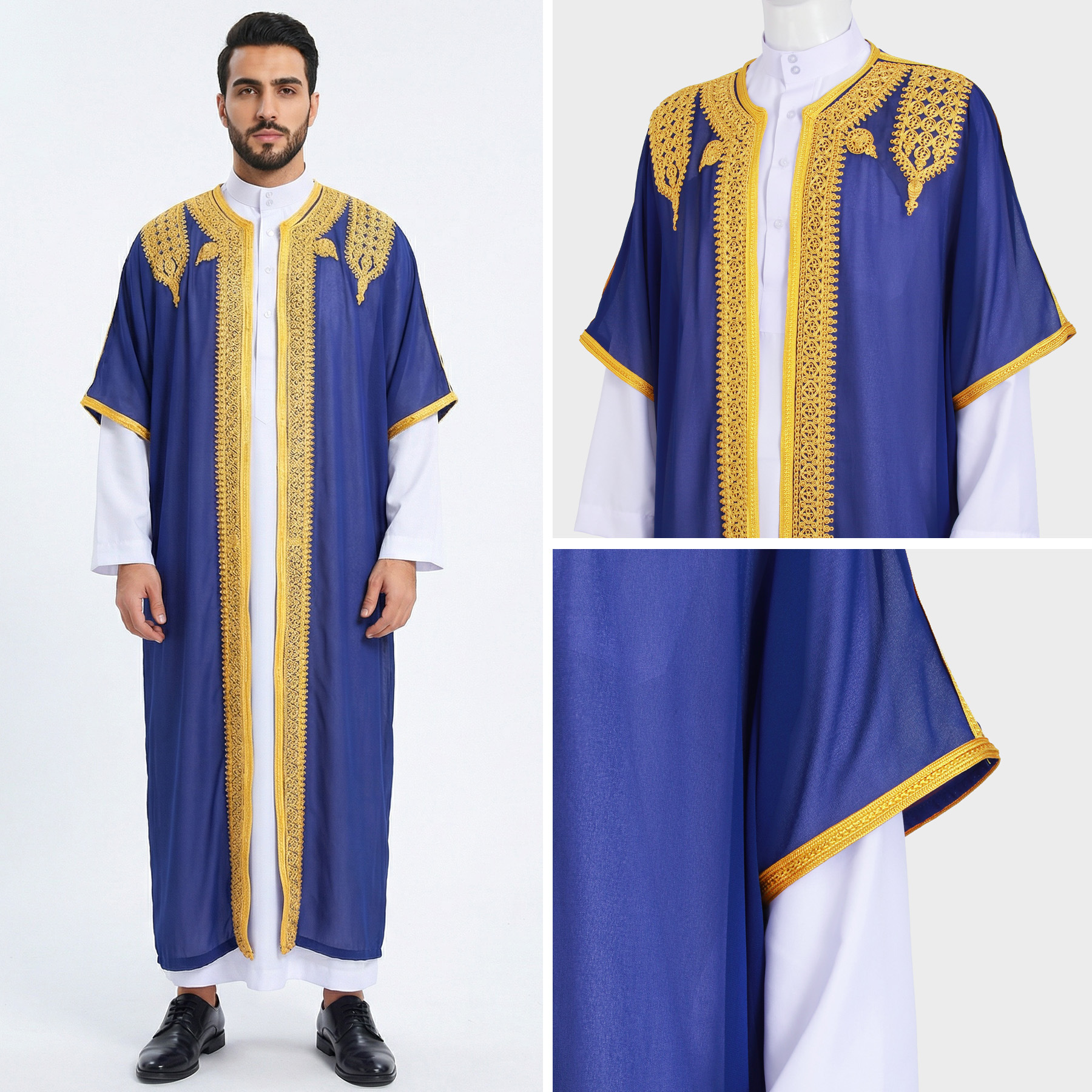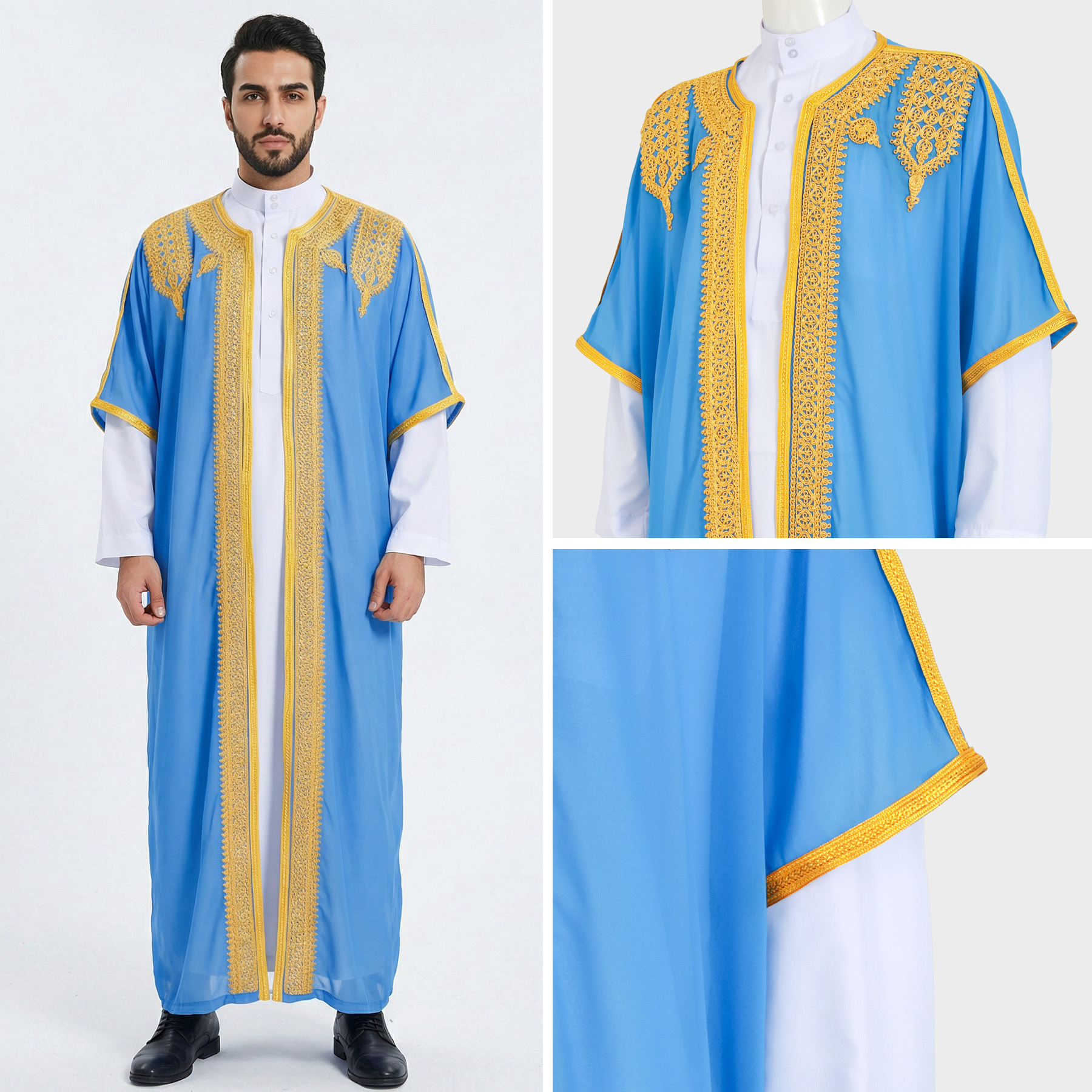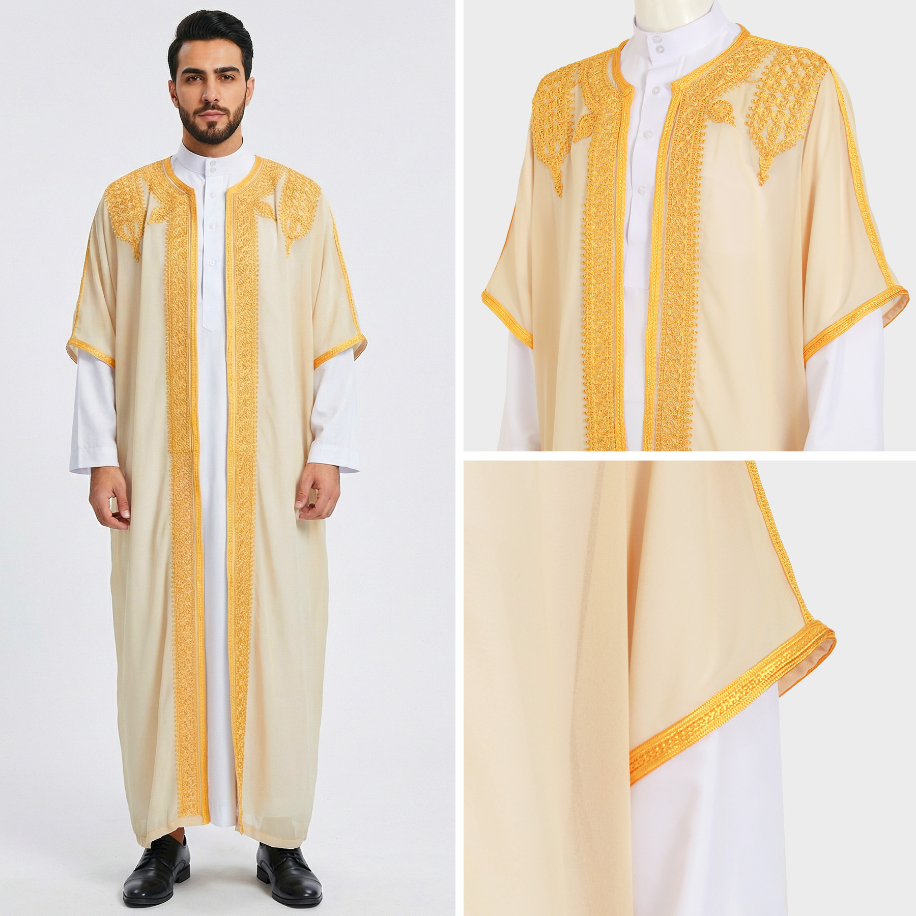 男士中东刺绣短袖外袍金边开衫礼服多色民族风Thobe外搭礼拜服