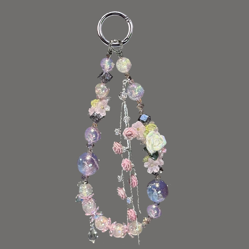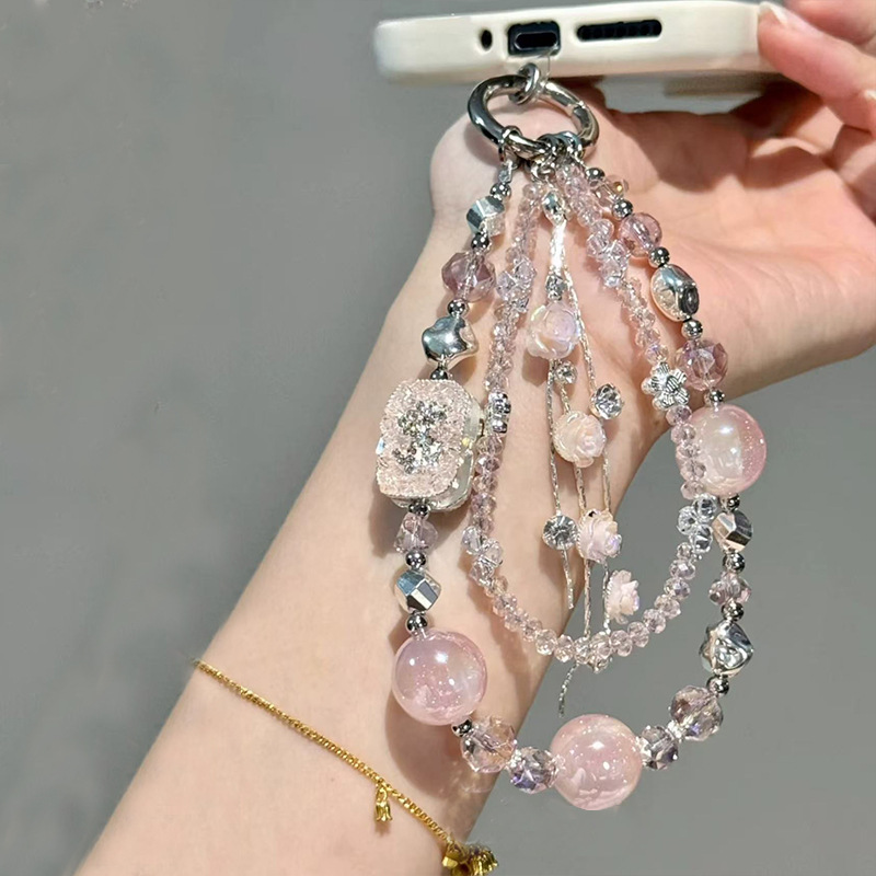 新款甜美粉色水晶串珠多层手机挂件小众高级感玫瑰花流苏手腕式挂
