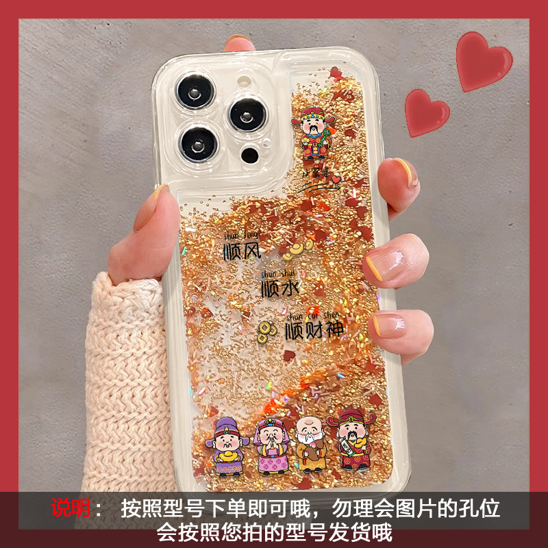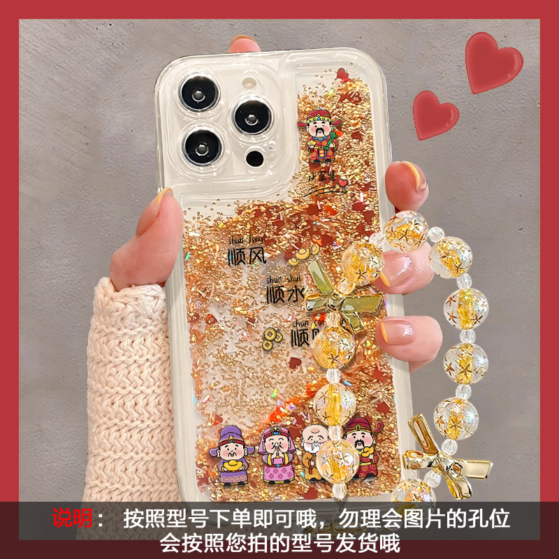 顺风顺水顺财神手链适用苹果16流沙手机壳15pro透明防摔14新年13