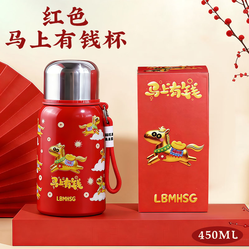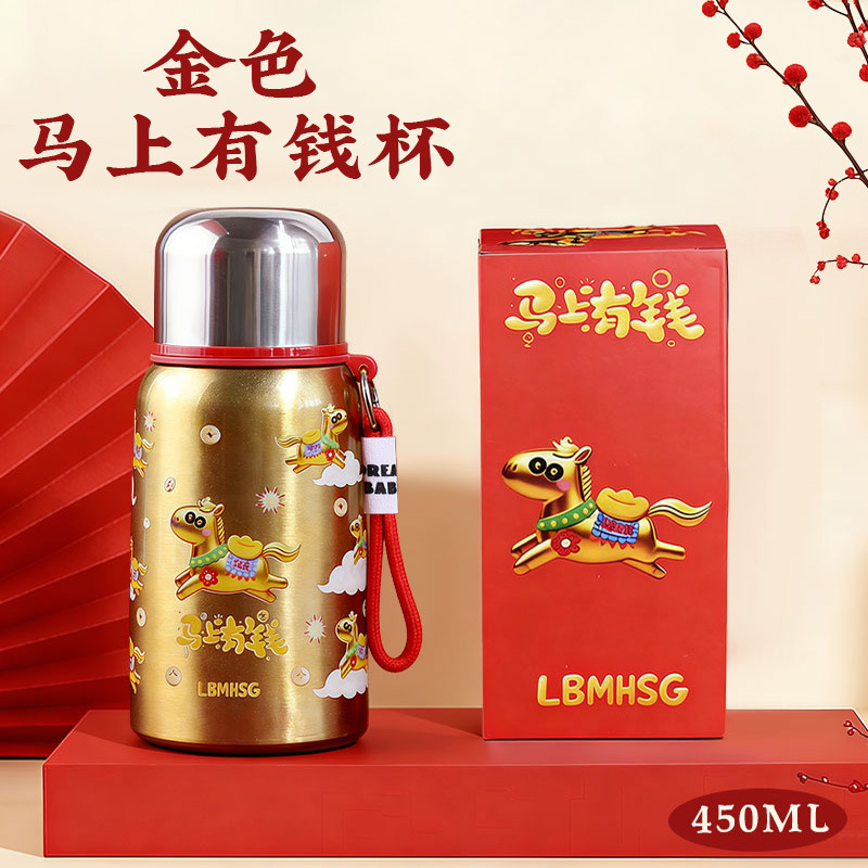 爆款马上有钱保温杯高颜值大容量新年礼物水杯户外便携提绳杯子