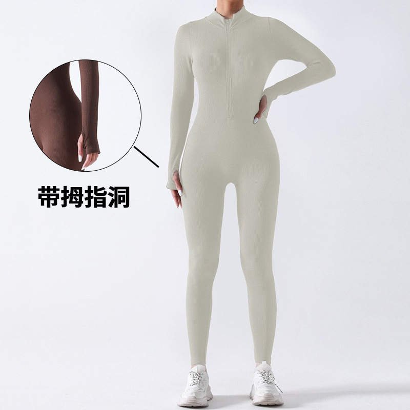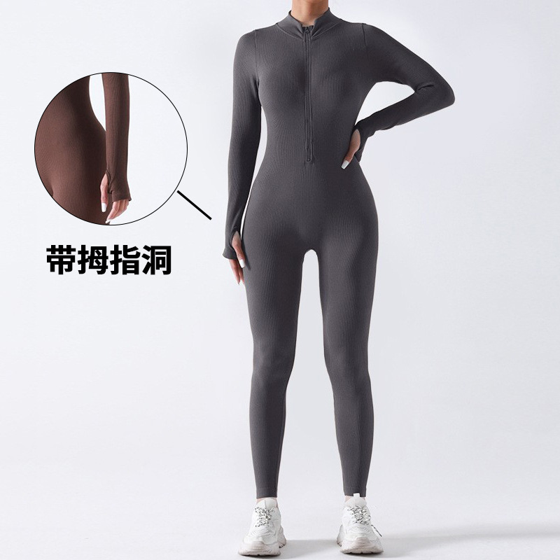 跨境秋冬螺纹拉链瑜伽连体服无胸垫运动训练紧身连体衣带拇指洞