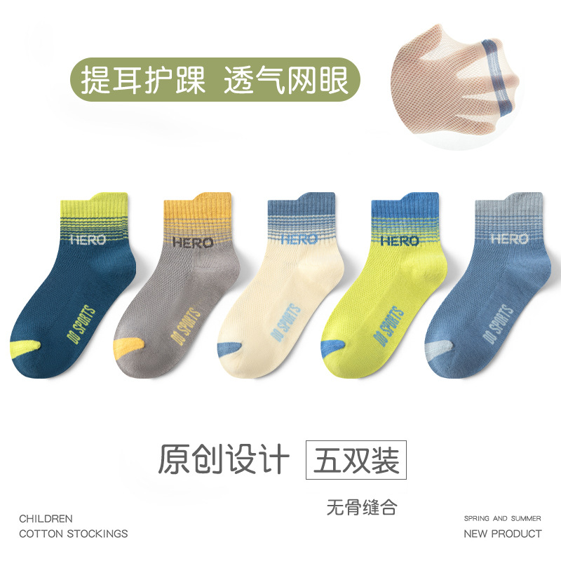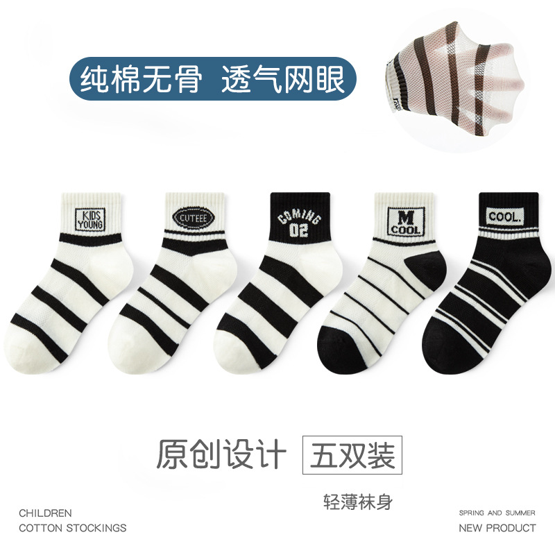 儿童袜子春夏薄款A类棉男童学生字母无骨网眼中筒运动袜吸汗防臭