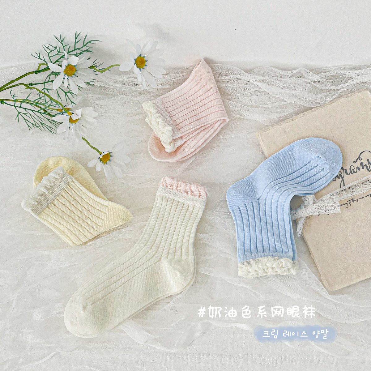 女童袜子夏季轻薄透气奶油花边无骨中筒袜春夏儿童袜子甜美公主袜