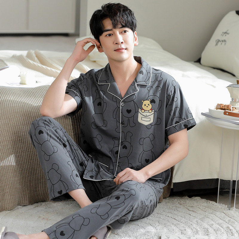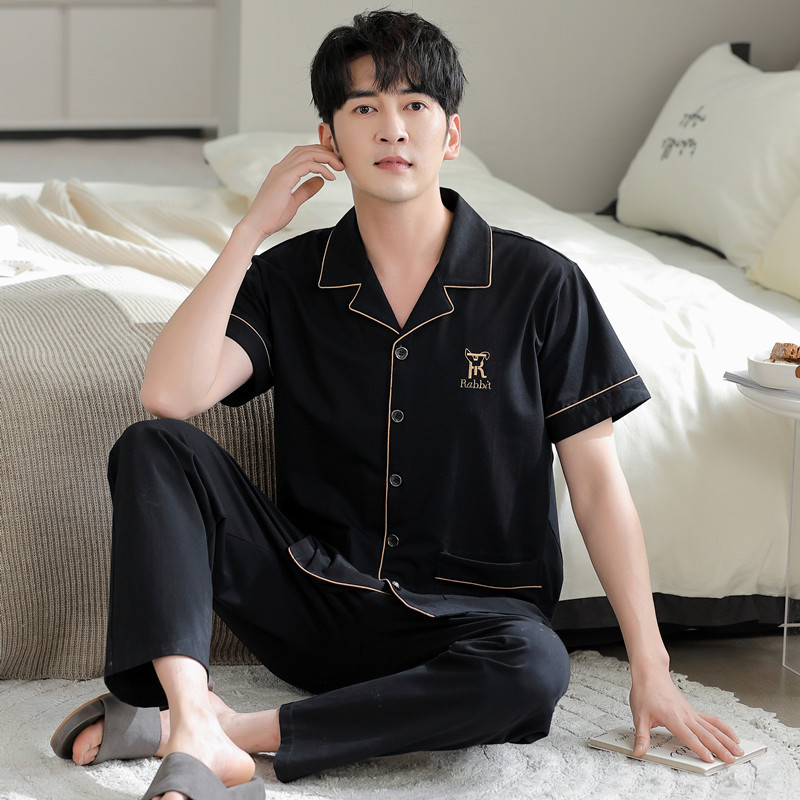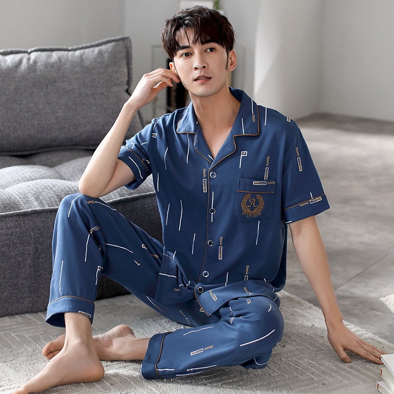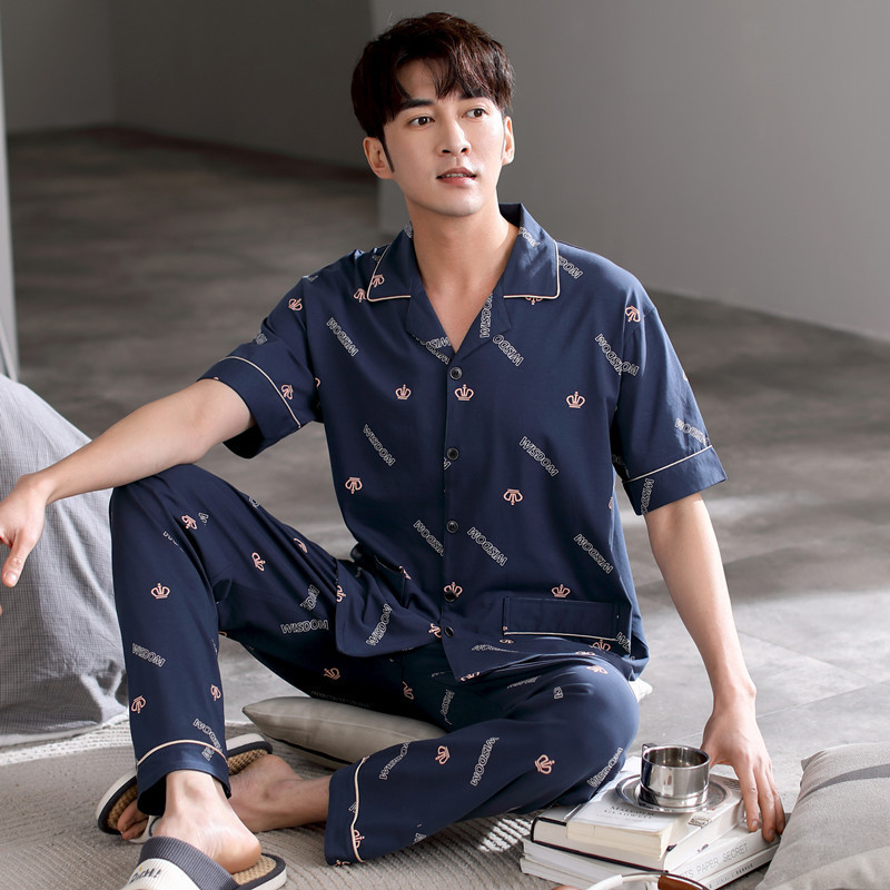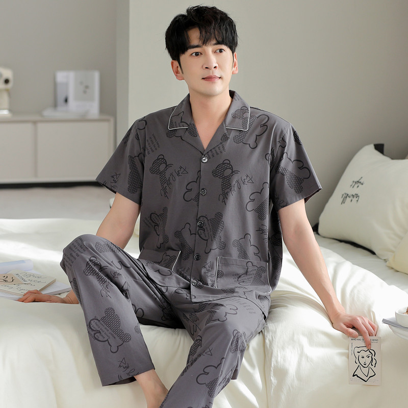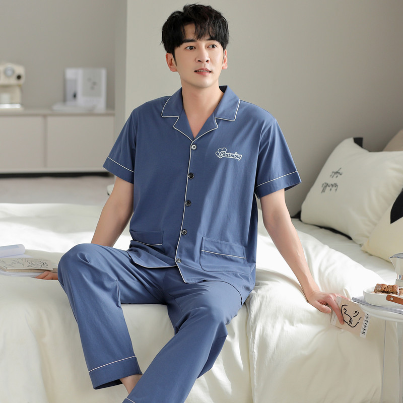 男士睡衣夏季纯棉短袖长裤薄款男式半袖中青年大码家居服套装夏天