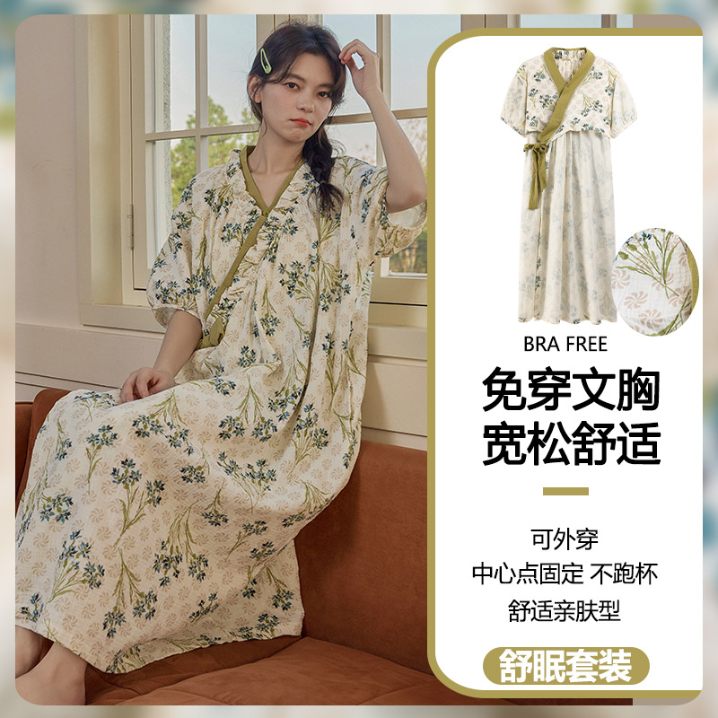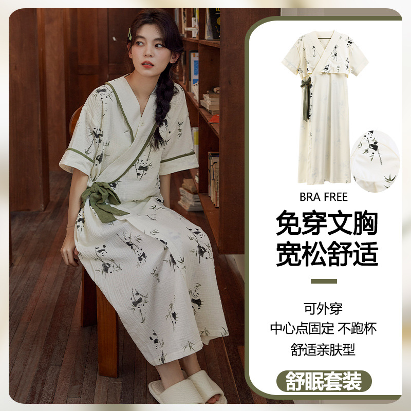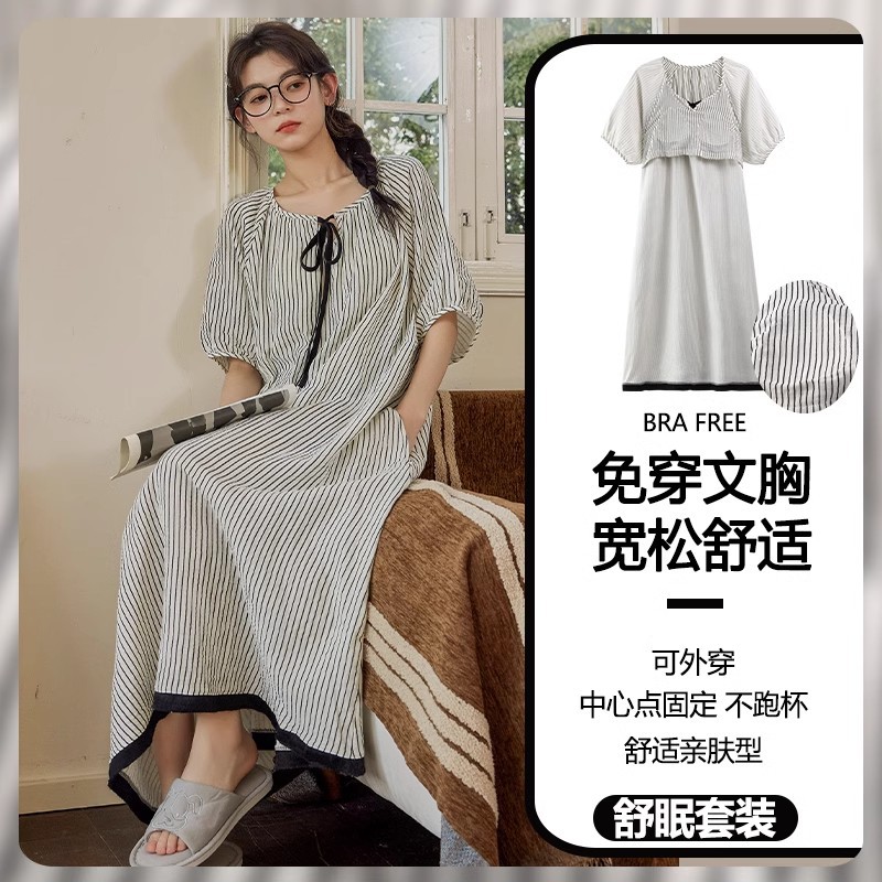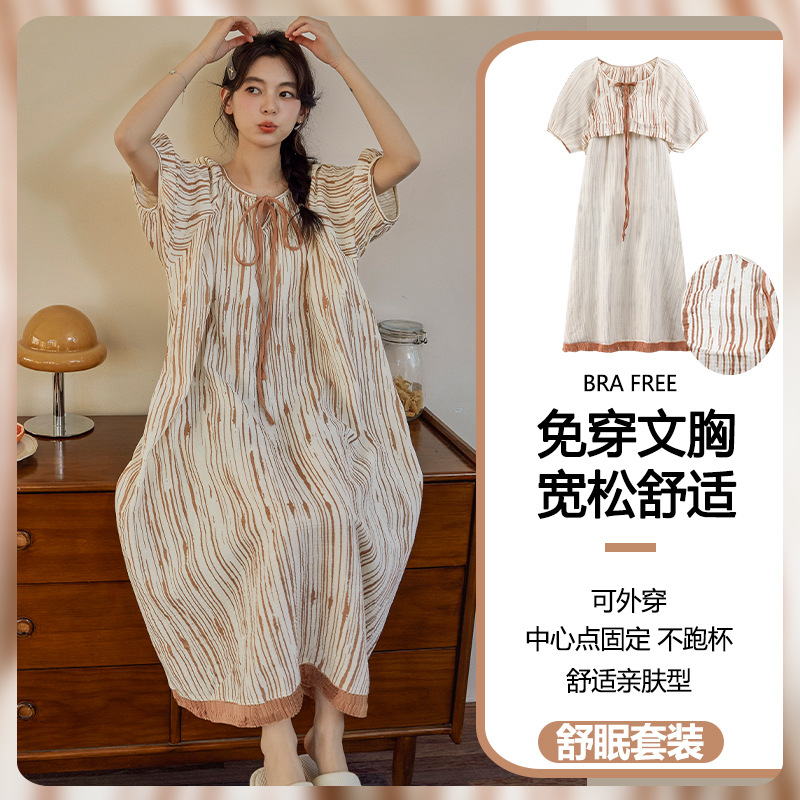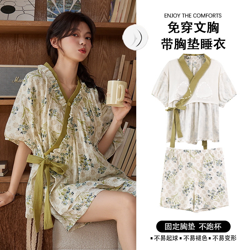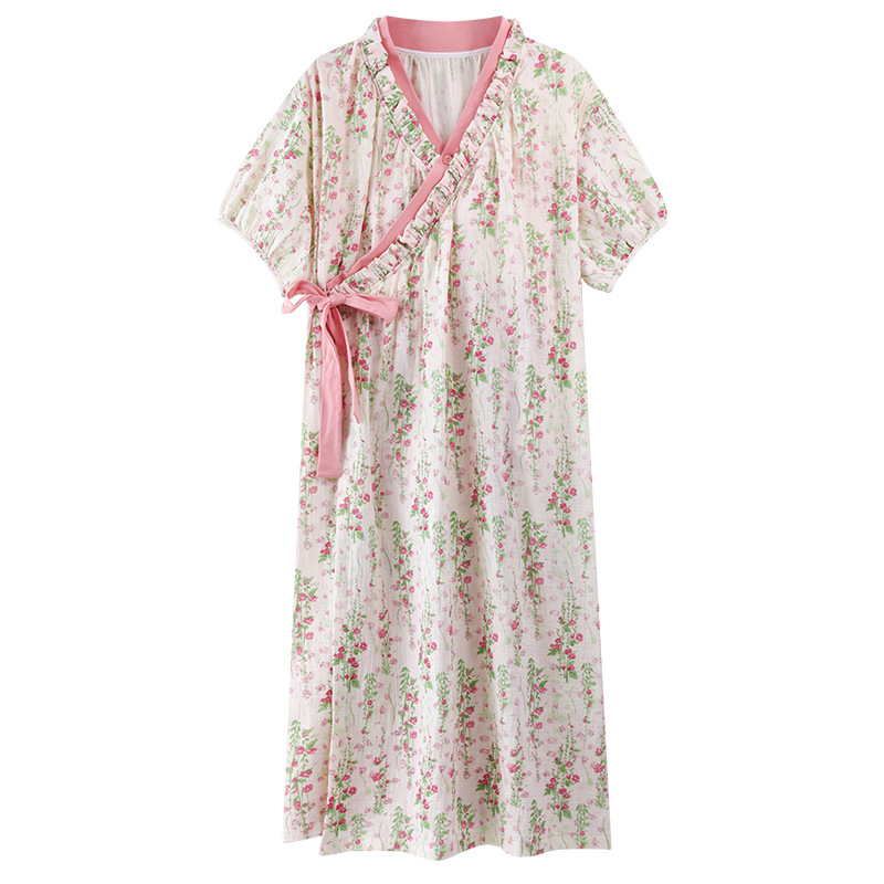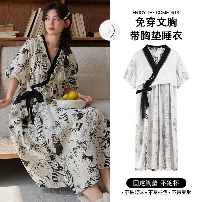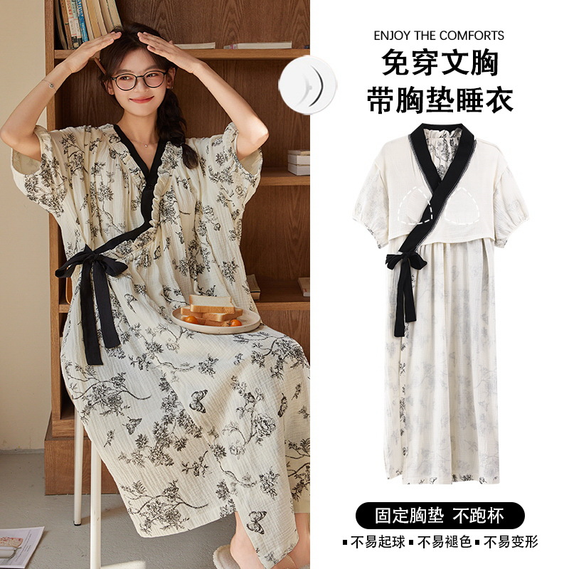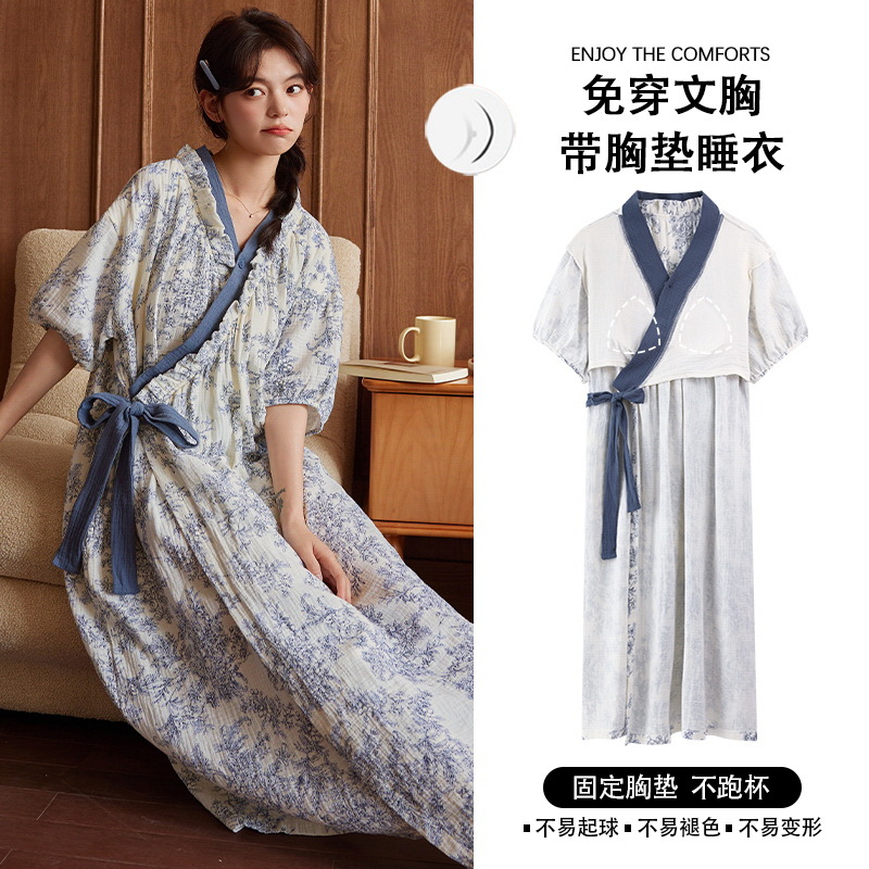 云朵棉系带睡裙女夏季甜美短袖睡袍和服中长款带胸垫睡衣家居服