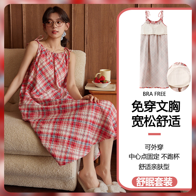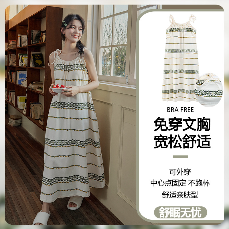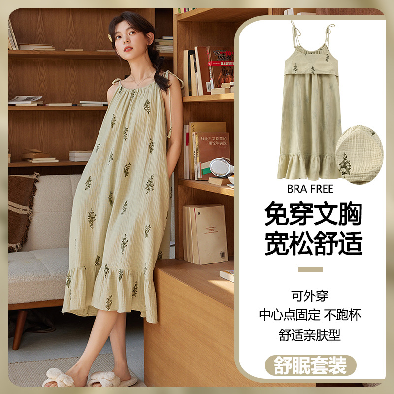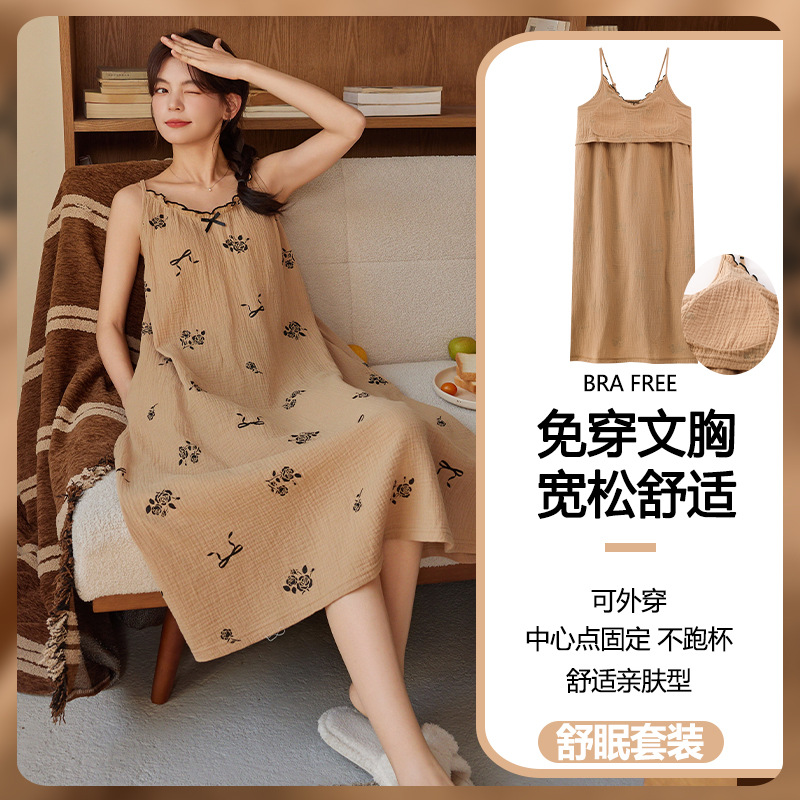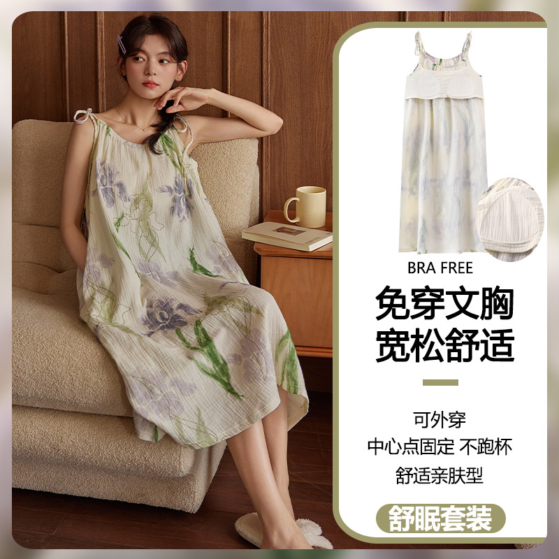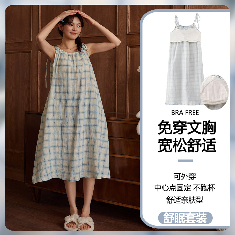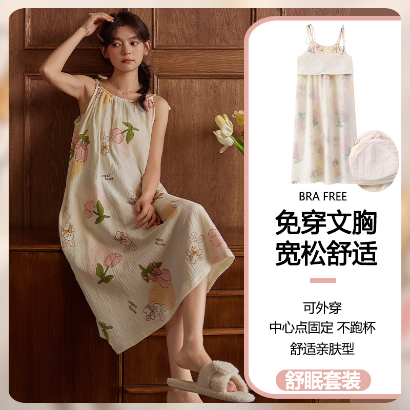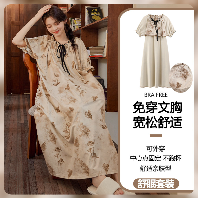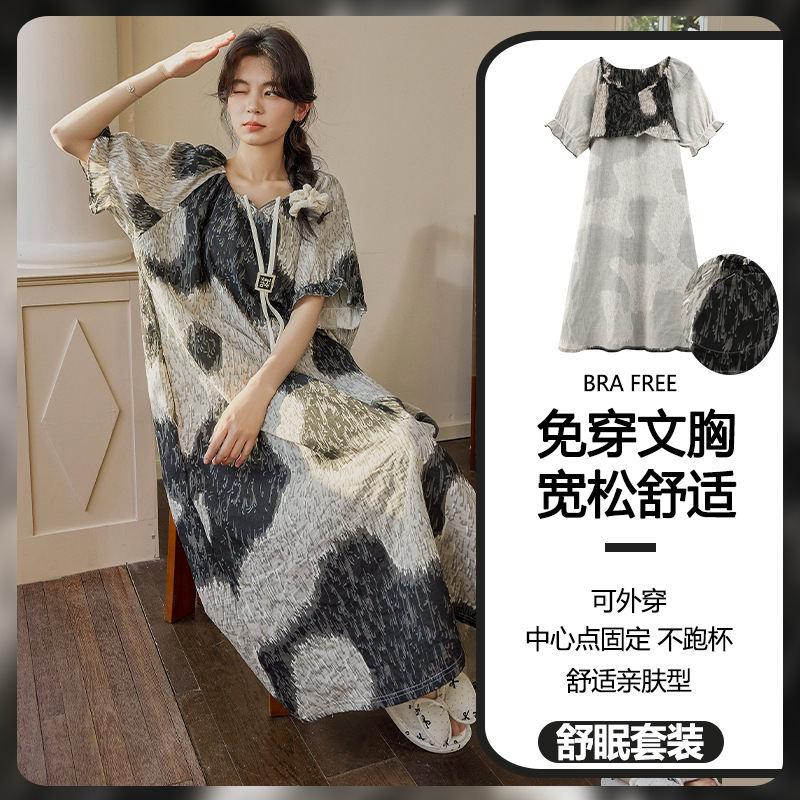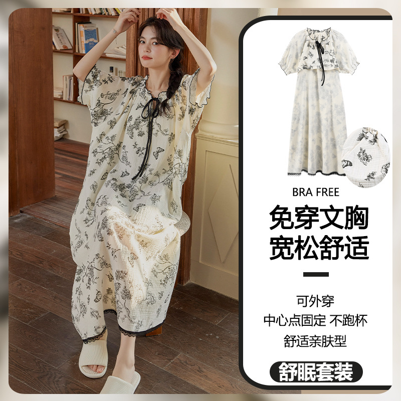 云朵棉系带睡裙女夏季甜美短袖睡袍和服中长款带胸垫睡衣家居服