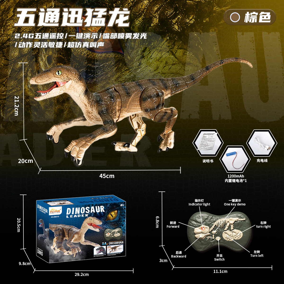 二代2.4G五通遥控迅猛龙-棕色【英文彩盒】