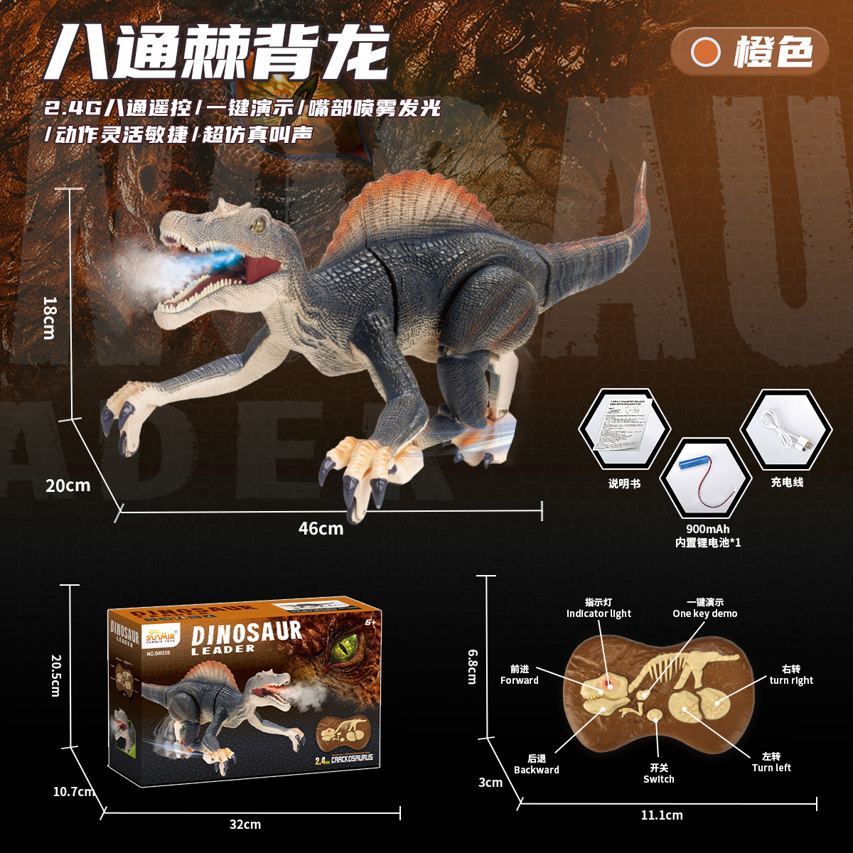 二代2.4G八通遥控棘背龙-橙色【英文彩盒】