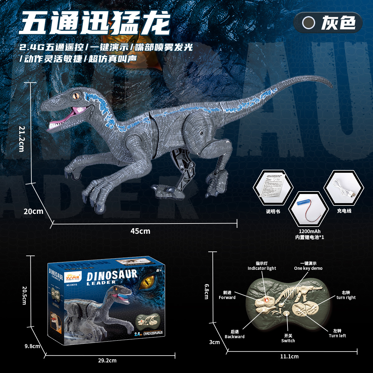 二代2.4G八通遥控暴虐龙-灰色【英文彩盒】