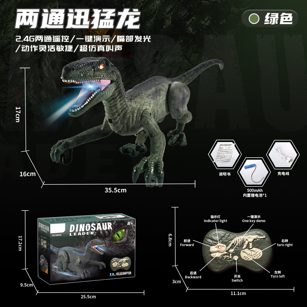 二代2.4G二通遥控迅猛龙-绿色【英文彩盒】