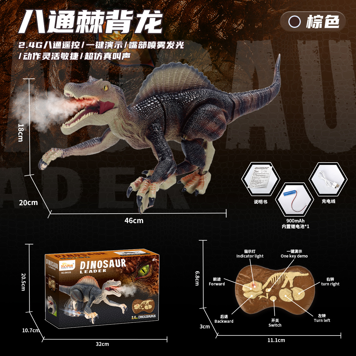 二代2.4G八通遥控棘背龙-棕色【英文彩盒】