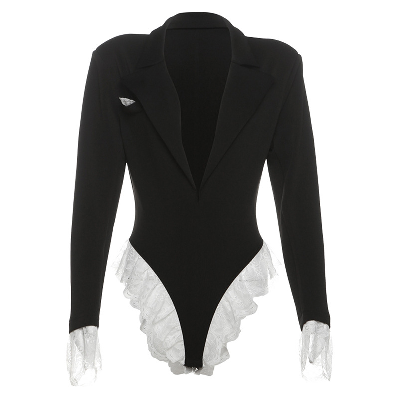 欧美风2024秋冬新款女装气质性感V领修身蕾丝拼接小西装连体衣女
