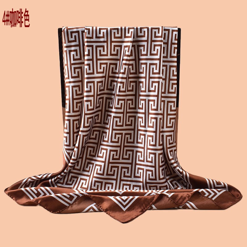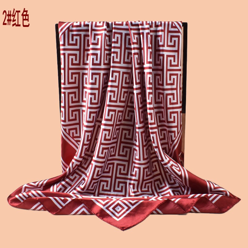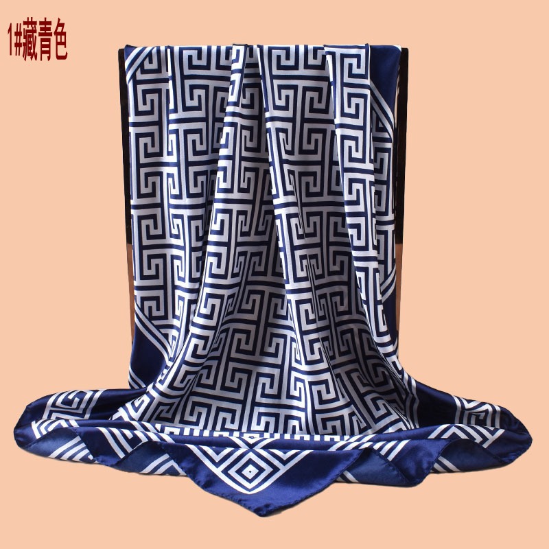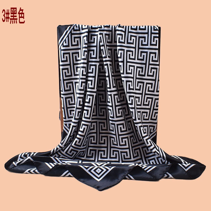 新款女士90CM色丁几何希腊回纹印花方巾外搭防晒包头丝巾围巾批发