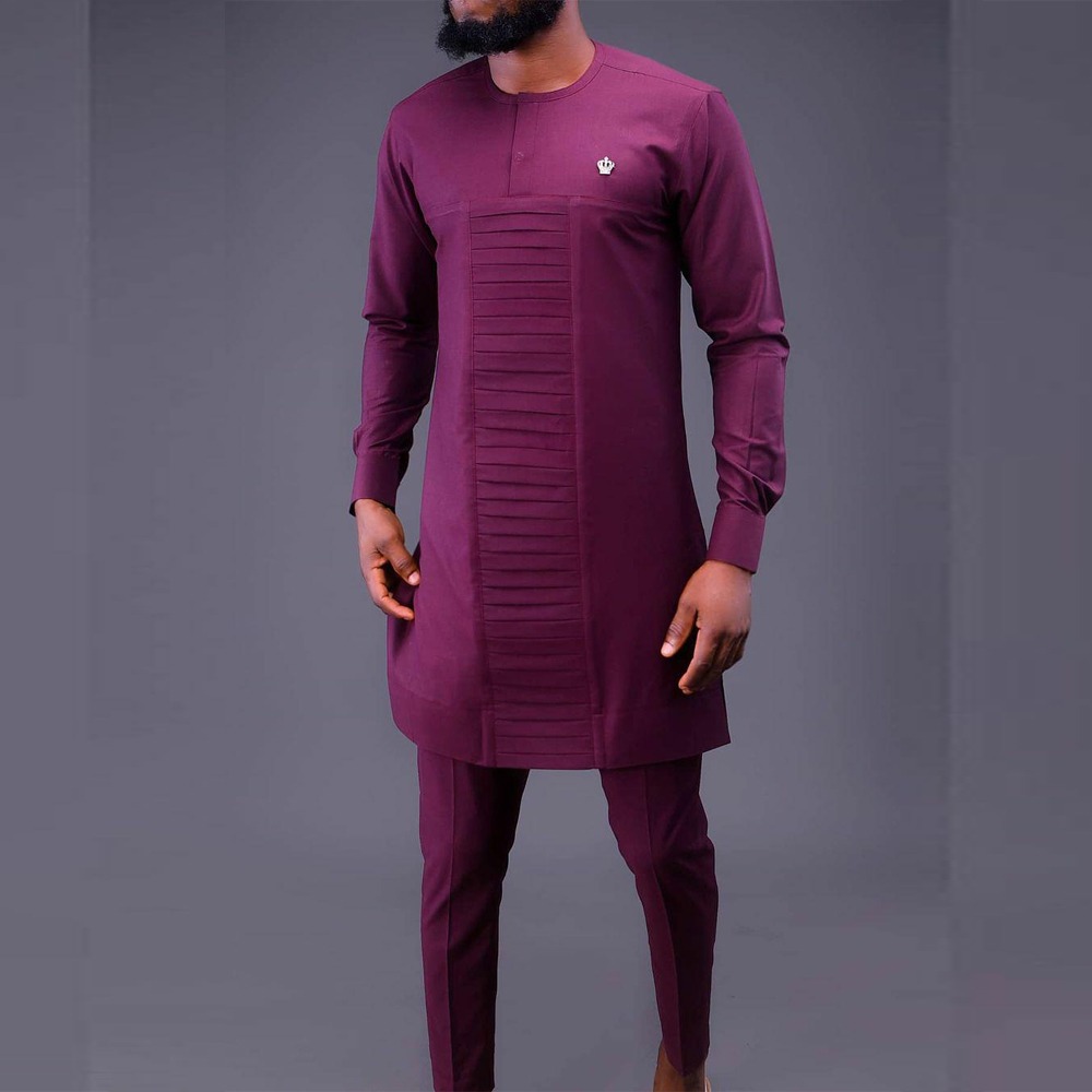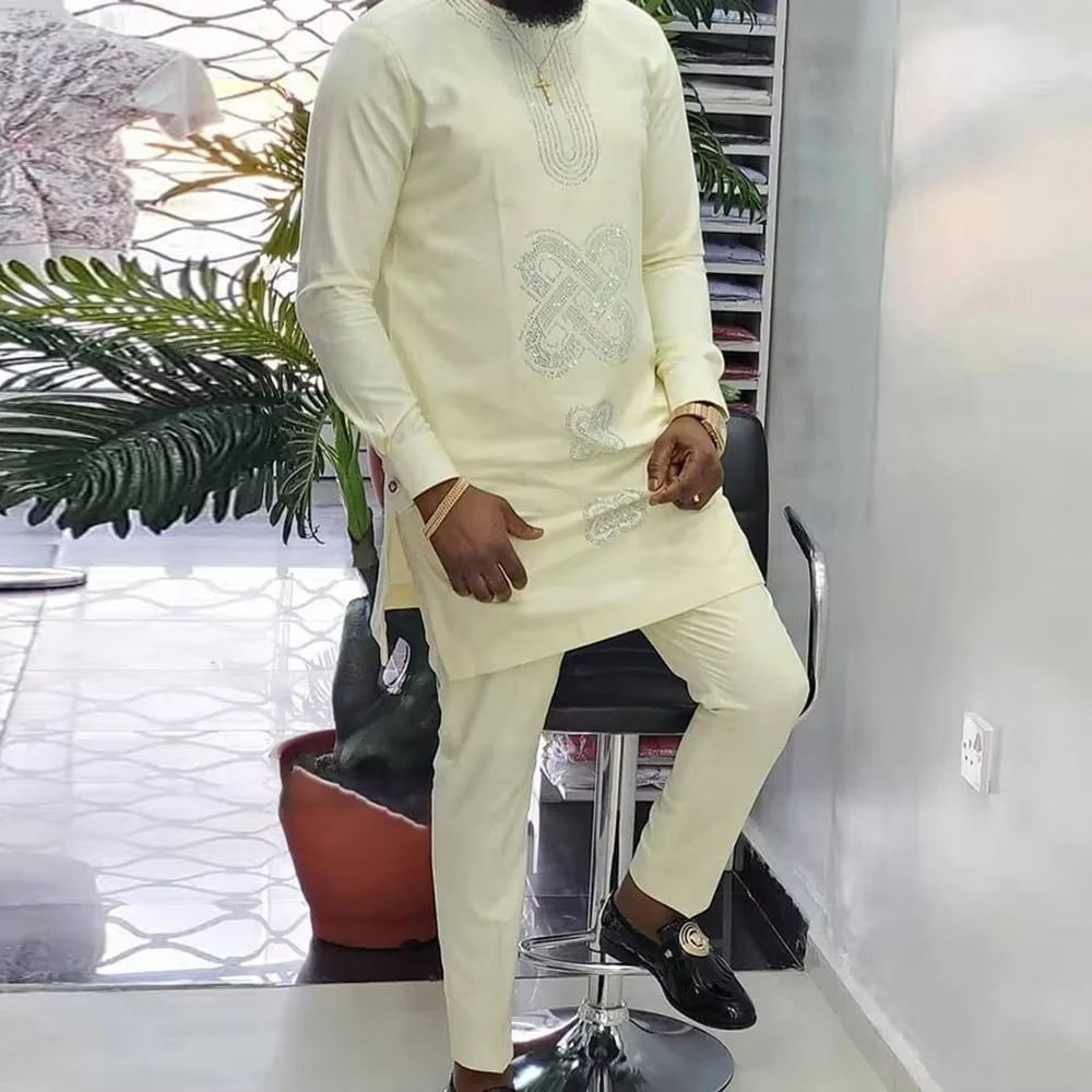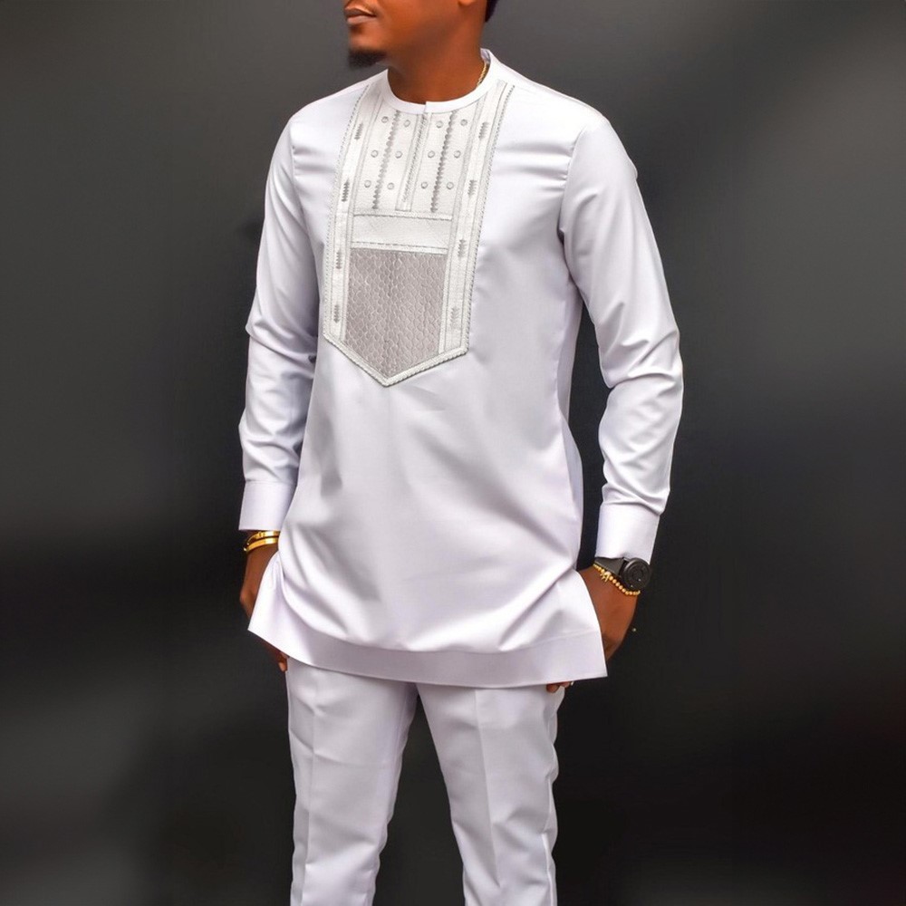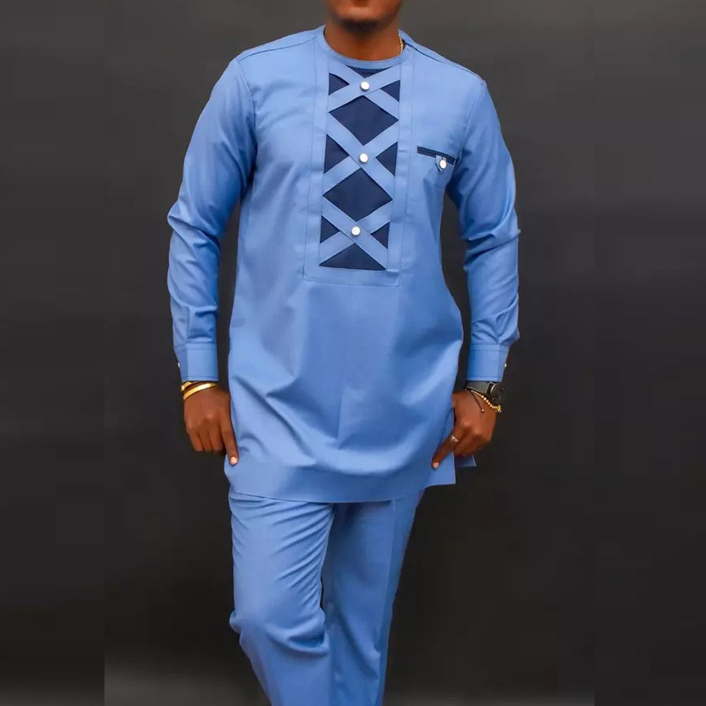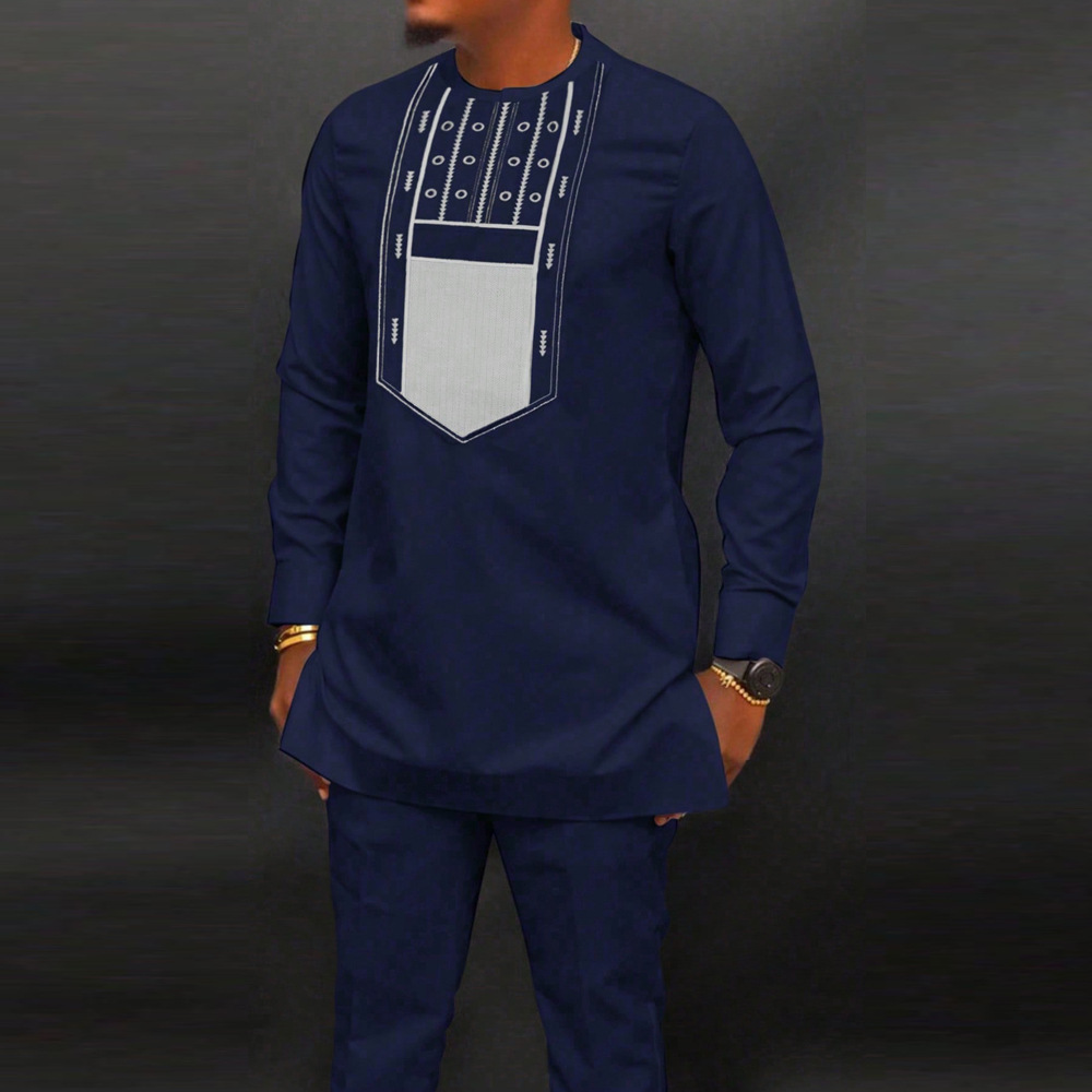 热销穆斯林非洲休闲百搭风格男士结婚西装2件套圆领长袖上衣裤子